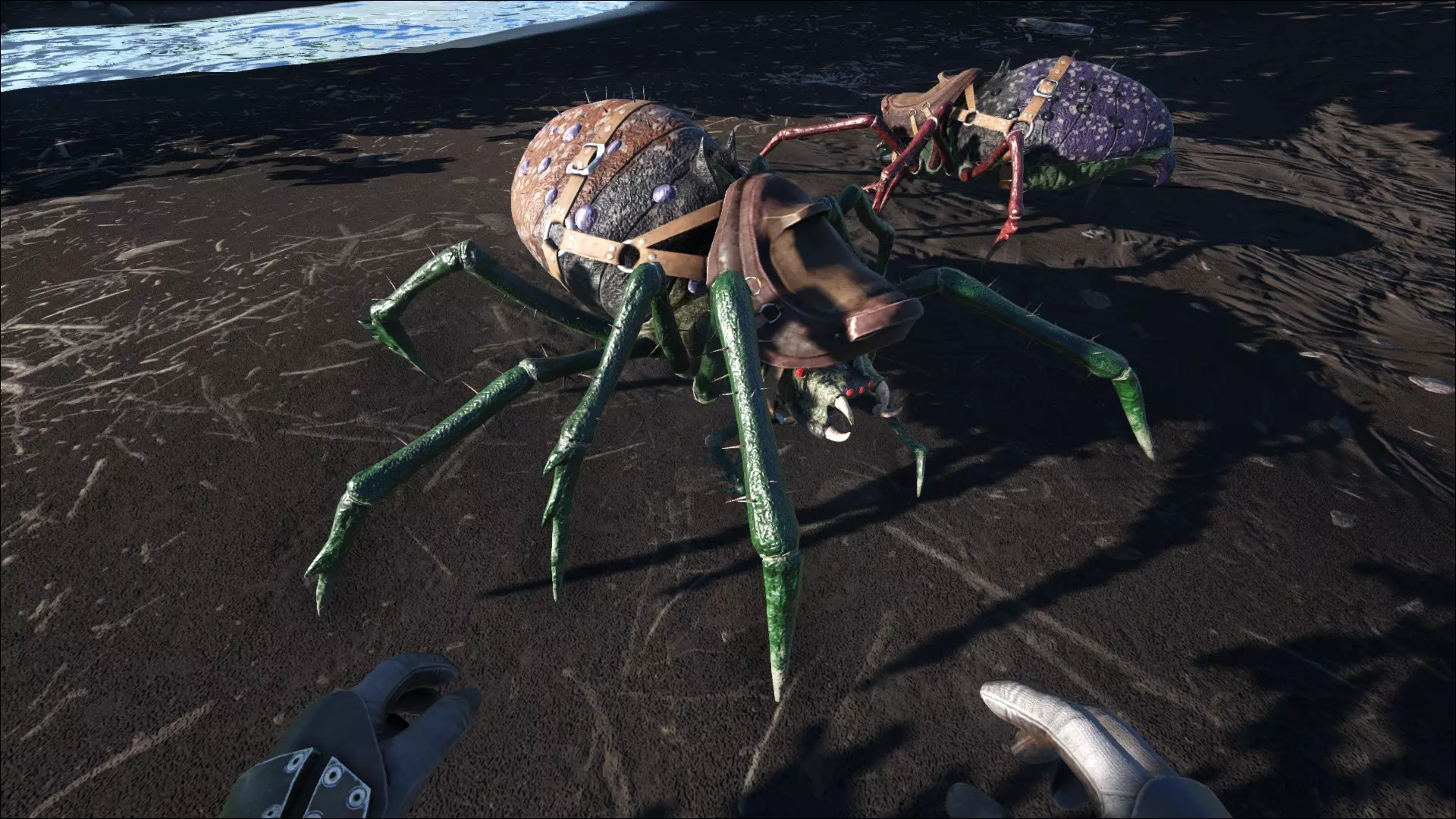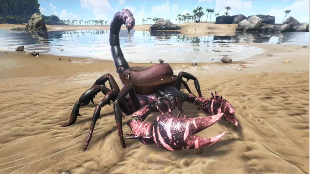 让我们从昆虫开始说起。提到昆虫,人们通常会想到苍蝇、小蜜蜂、大黄蜂、瓢虫,或者蜘蛛、蚊子和蚱蜢。由于我们这里讨论的是一款生存游戏,我们需要明确一点,这里的昆虫并不一定是我们在城市公园中遇到的那种小巧可爱的生物。只有蜻蜓、会跑和会飞的蚂蚁比我们平时见到的稍大一些(而且超级烦人且危险)。还是那些大型爬行动物更好些,至少(大多数时候)能看得见它们。这其中包括比人还高的螳螂,体型仍有半人大小的蜘蛛,体型不小的屎壳郎,当然还有可以骑乘的飞蛾。人们也很乐意砍掉千足虫的千条腿,而且面对它时更愿意逃跑,尤其是它还像羊驼一样吐口水——不同的是,被它吐到不仅会让人觉得恶心,它的口水实际上还具有腐蚀性。顺便说一下,蝎子也在其中。体型更大,当然也有毒。而且和大多数其他昆虫一样可以骑乘,前提是你能克服心理障碍去接近它们。