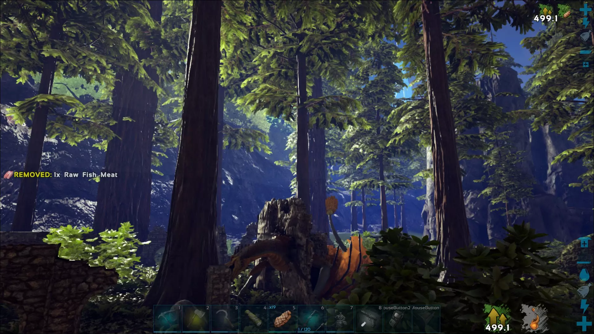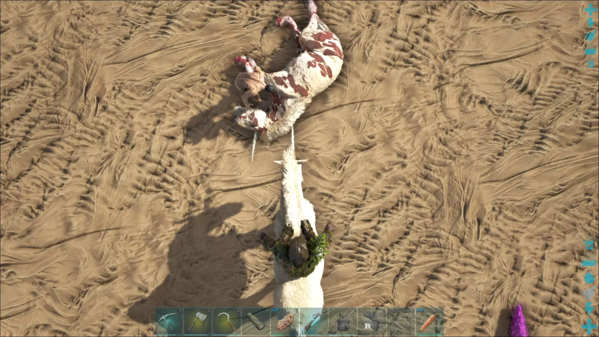 当然,也得有些东西能啃着吃。原则上浆果也行,但一块烤肉带来的能量明显更多,而且那些被驯服的食肉动物也需要喂食。此外,有时候还需要让肉腐烂。听起来像是浪费,但这对制作麻醉剂很重要,而麻醉剂在驯服动物时往往需要大量使用。这简直是个恶性循环!任何思维正常的人现在都会选择食肉动物去打猎——毕竟它们是天生的猎手。不过,强壮的食草动物也能造成不小的伤害。只是那些素食恐龙自己没办法收集肉,所以至少在这方面你得亲自动手。杂食动物同样适用,它们和肉食动物一样可以自行处理猎物。昆虫也是如此,尽管它们在捕猎方面的适用性有限。