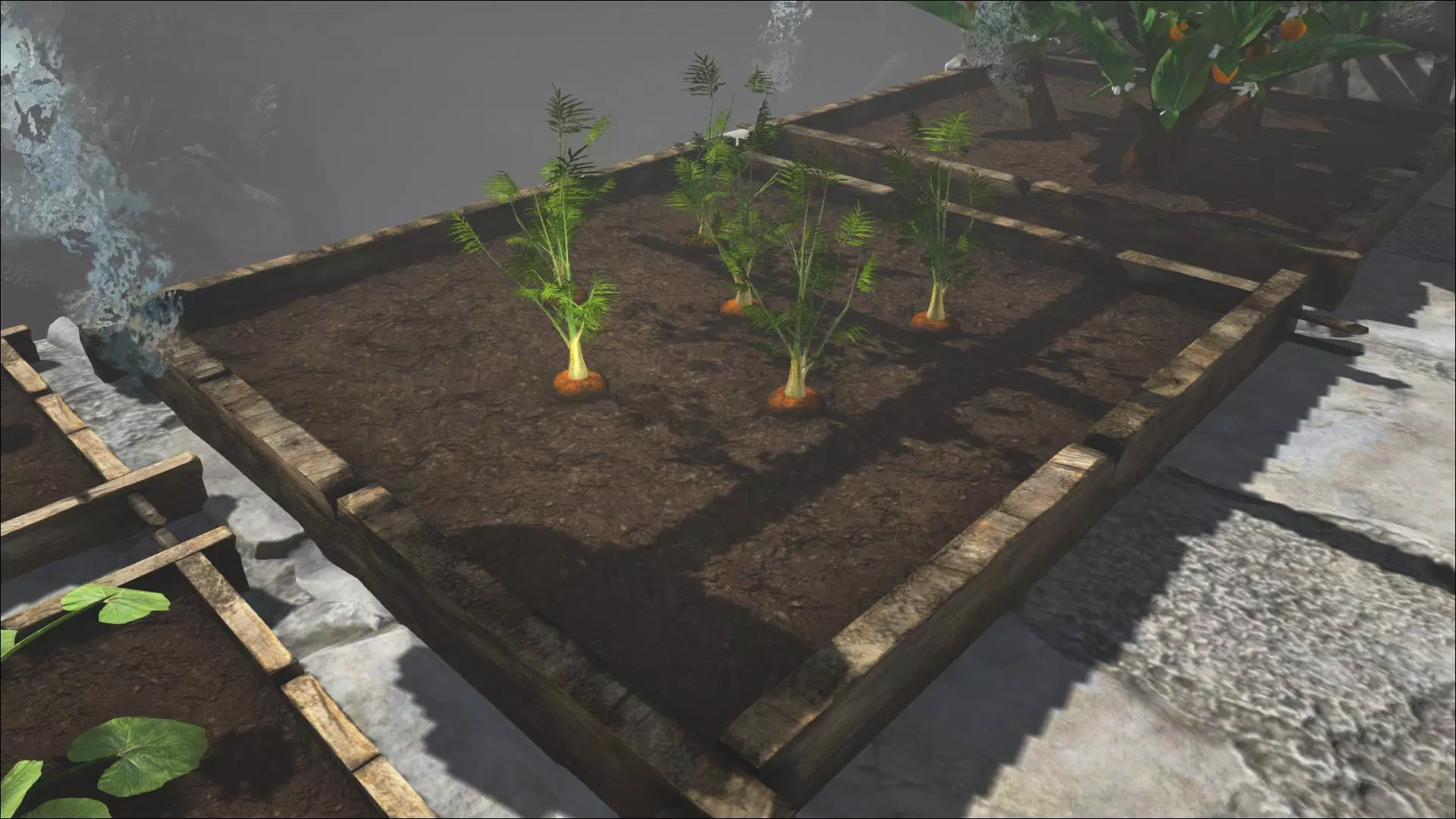 艾伦树木的共同之处在于,无论在哪里都能获得完全相同的木材。这当然很可惜——我本希望能获得不同的木材,这样就能让建筑结构呈现出与所用建筑木材相对应的颜色和纹理。这里无疑错失了一个机会(可以对比一下《我的世界》)!灌木和蕨类植物的情况也类似。无论生长在哪里,它们都只会产出相同的浆果和纤维。在这方面,本可以做得更好,让收集特定浆果的过程更具挑战性。真遗憾。不过,树液只能从猛犸树中获得,仙人掌汁则来自仙人掌(注意,Kacktussen是另一种东西!)。此外,还有一些特定的花朵可以产出丝绸。