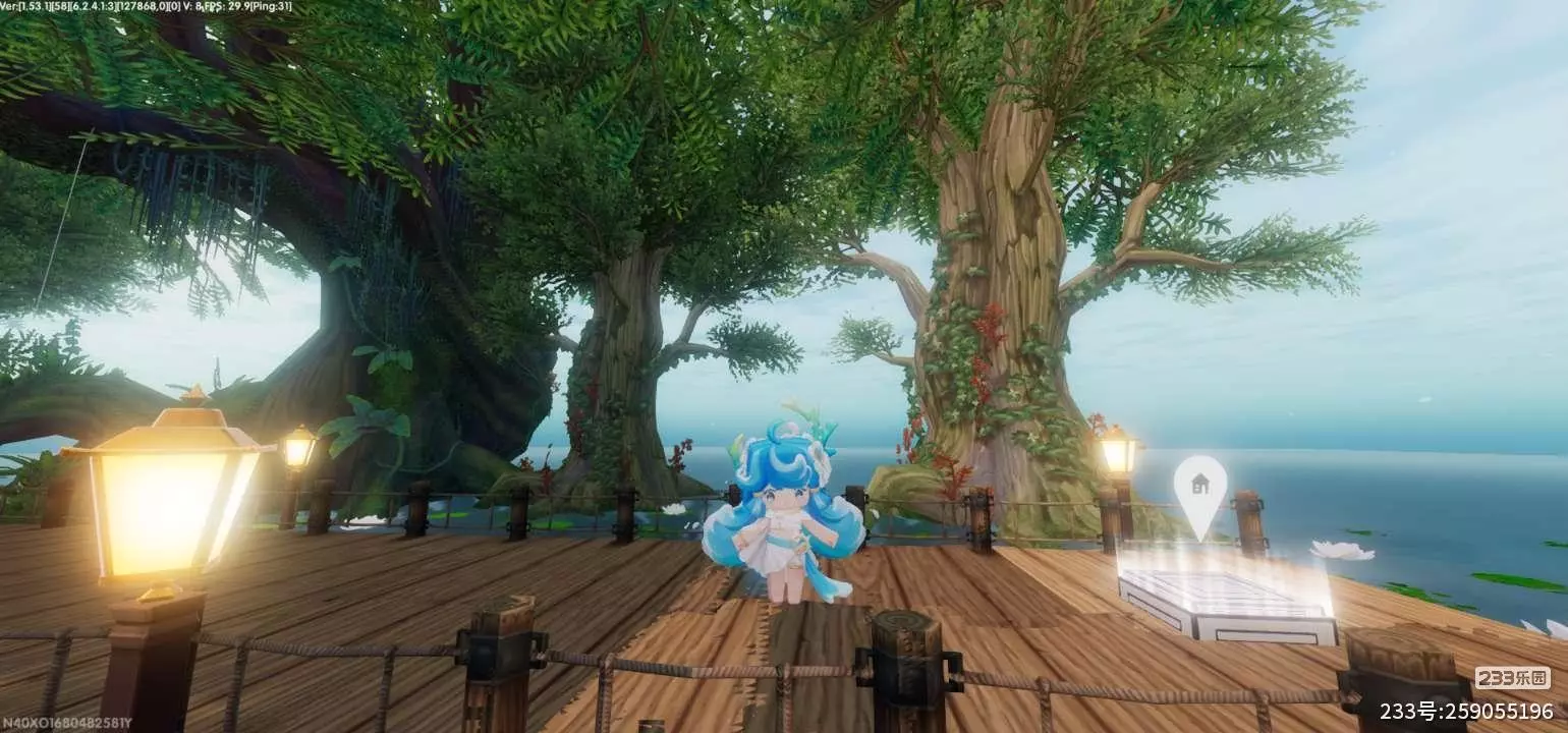 栈道由深浅不一的原木铺就,绳索护栏在风里轻轻晃荡,暖黄的路灯次第亮起,把木纹的纹理和海雾的朦胧都晕成了温柔的暖调。三棵巨树在栈道尽头舒展着浓绿的枝叶,粗壮的枝干盘虬卧龙,气根垂落如帘,叶隙间漏下的天光碎成星点,落在蓝发少女的浪花发饰上,折射出细碎的光。