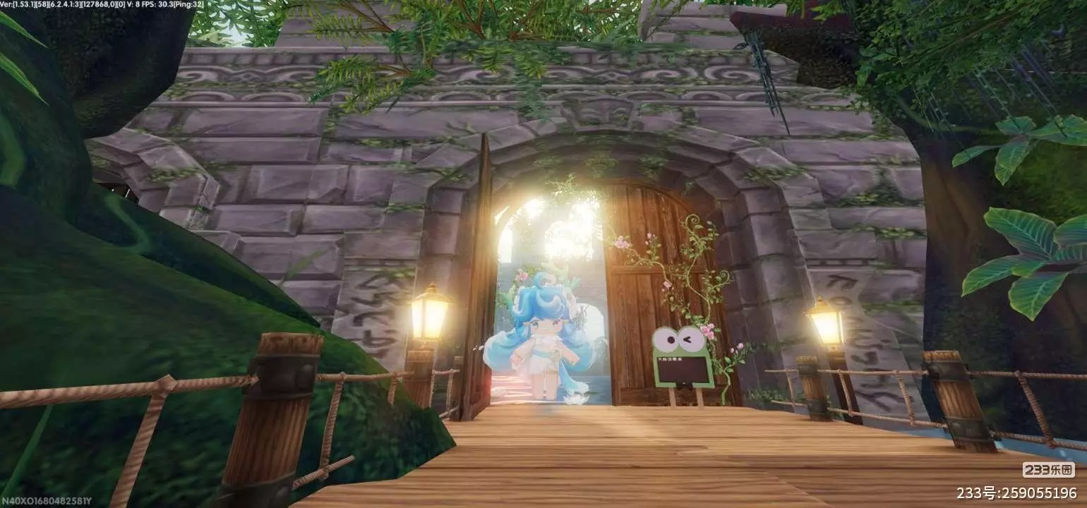 晨雾还未散尽,古老石拱门的藤蔓在风里轻晃,暖黄的路灯把木纹栈道染成温柔的浅金。我从半开的木门后缓缓走出,发间的浪花装饰在晨光里折射出细碎的光,身后拖曳的蓝白裙摆像被海风揉碎的浪涛。门旁的青蛙告示牌眨着一只眼,粉花藤蔓顺着木门攀援而上,石墙上的古老纹路在晨雾里若隐若现,仿佛在诉说着秘境的传说。晨光驱散了最后一丝寒意,树影与海色在雾霭里交融,海浪拍打的节奏、树叶摩挲的轻响,和我的裙摆扫过木板的细碎声响交织在一起,像是把整个世界的温柔都藏在了这片秘境的晨光里。