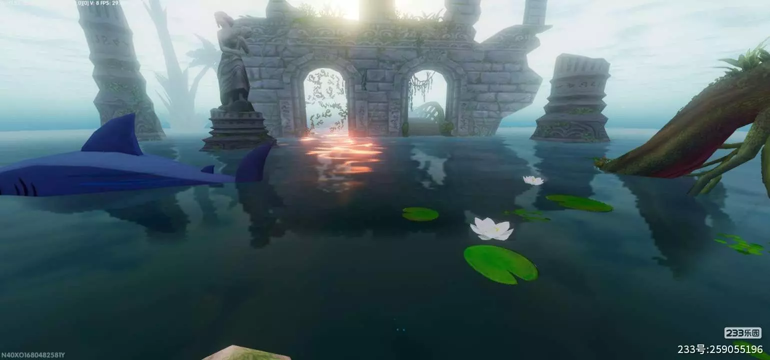 水面如镜,映着晨光与石影,白睡莲在绿盘间悄然舒展,蓝鲨的尾鳍划破静谧,留下细碎的涟漪。石雕像在水中静立,仿佛守护着这片被遗忘的秘境,而拱门后的光,像在指引着通往未知的路。风掠过水面,带着咸湿的气息,把时光的低语藏进每一片涟漪里。这里是被海水拥抱着的遗迹,每一块石头都在诉说着古老的故事,每一片涟漪都在记录着岁月的温柔。