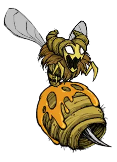 蜂后(Bee Queen) 蜂后(Bee Queen)是《饥荒:联机版》“ reign of giants”DLC中新增的 Boss。当巨大蜂巢上的蜜滴全部消失时,它会从蜂巢中出现。它会留下能使角色减速的蜂蜜轨迹,攻击时也会产生这种轨迹。它有三种阶段性状态,会随着生命值的降低而切换: 第一阶段在巨大的无泄漏蜂巢被锤子惊扰时触发。此阶段会召唤4只雄蜂提供援助;战斗中,当雄蜂数量减少至0时,会再次召唤4只。该阶段的最佳策略是留下1只雄蜂,集中攻击蜂后。 进入第二阶段时,会额外召唤4只雄蜂。当至少有两只雄蜂死亡时,会再召唤4只(最多10只)。在此阶段,它会发出叫声,使友方生物(如猪)陷入恐慌。 在第三阶段,蜂后几乎不再主动攻击,而是开始发出一系列叫声,使雄蜂进入狂暴状态,提升它们的移动速度。