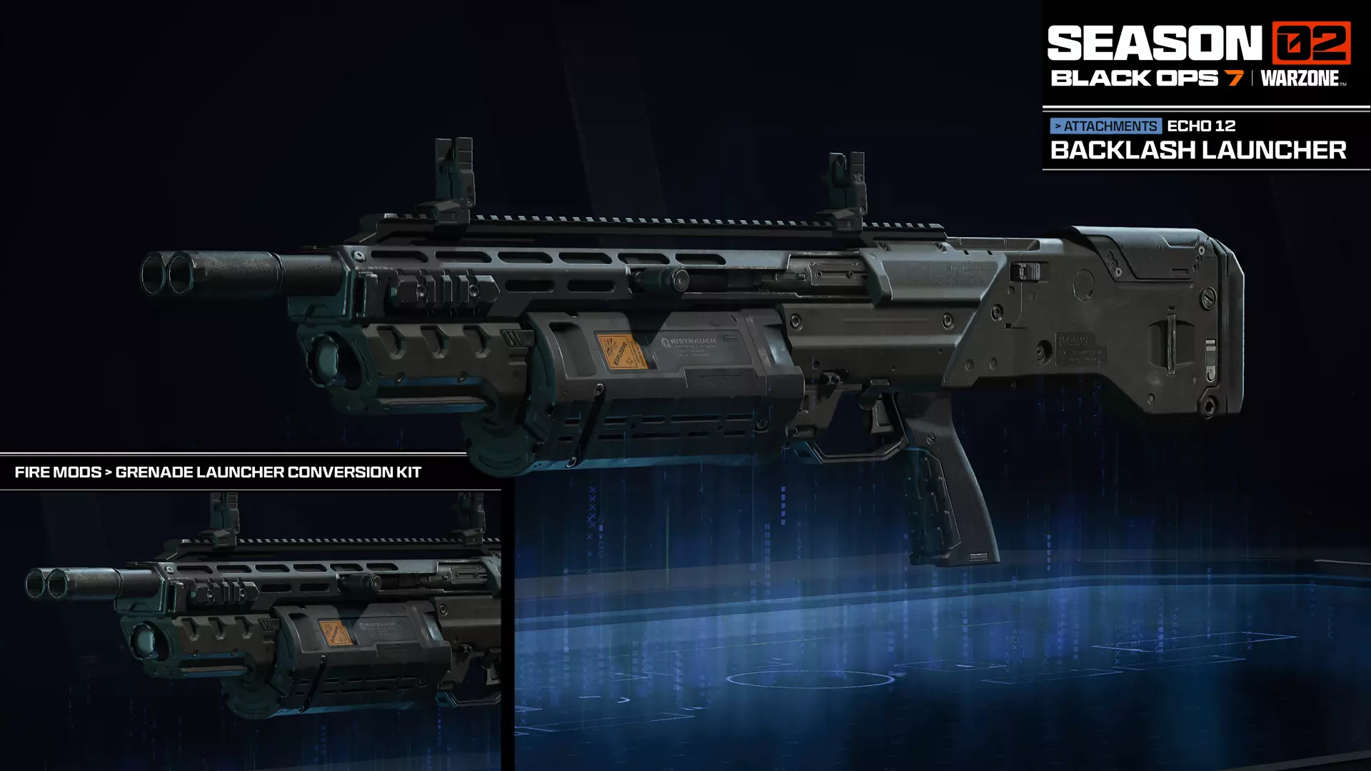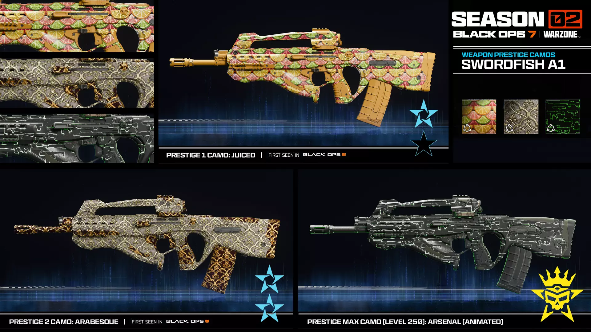 剑鱼A1的通用武器声望迷彩(如上):声望1:【Juiced】(首次出现于《使命召唤:黑色行动4》)。声望2:【Arabesque】(首次出现于《使命召唤:黑色行动4》)。声望满级:【Arsenal】(动态效果)。 新增:武器配件 Echo 12反冲发射器套件 Echo 12霰弹枪,活动奖励 配件>开火模式>榴弹发射器改装