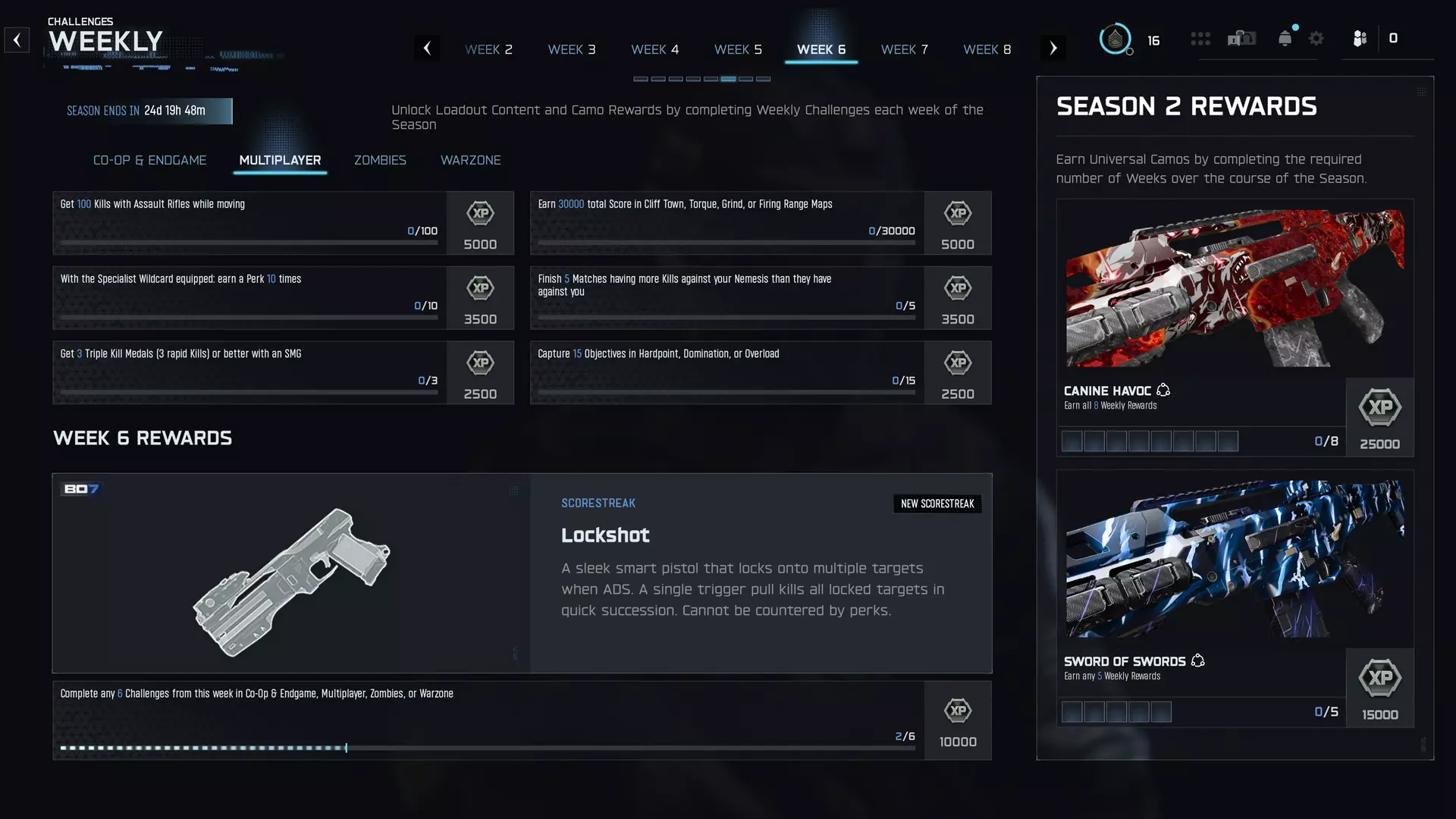 在悖论枢纽活动中证明你有能力击败对手,该活动提供各种嚼嚼糖奖励,以减轻你后续僵尸行动的负担。继续攀升还能获得额外奖励,如【Outreach】武器迷彩、【Citizens】动态武器迷彩等。 每周挑战 职业 > 挑战 > 每周挑战