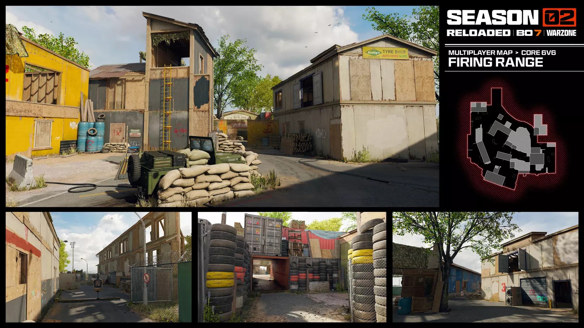 标志性的滑板公园最初于《使命召唤:黑色行动2》中登场,将在季中更新中回归。你可以在公园内及相邻的专业商店与敌人交战,也可以前往广阔的滑板碗和高耸的半管区域,这里视野开阔且具有多层垂直空间,让战斗持续不断。 利用坡道和变化的海拔高度占据优势,流畅地接连消灭敌人,创造精彩战局,尤其是新增的 wall jump 路线为你开辟了新的路径,无需再像以前那样长途奔袭。 靶场 地图从《使命召唤:黑色行动6》回归,支持6v6,为小型规模。