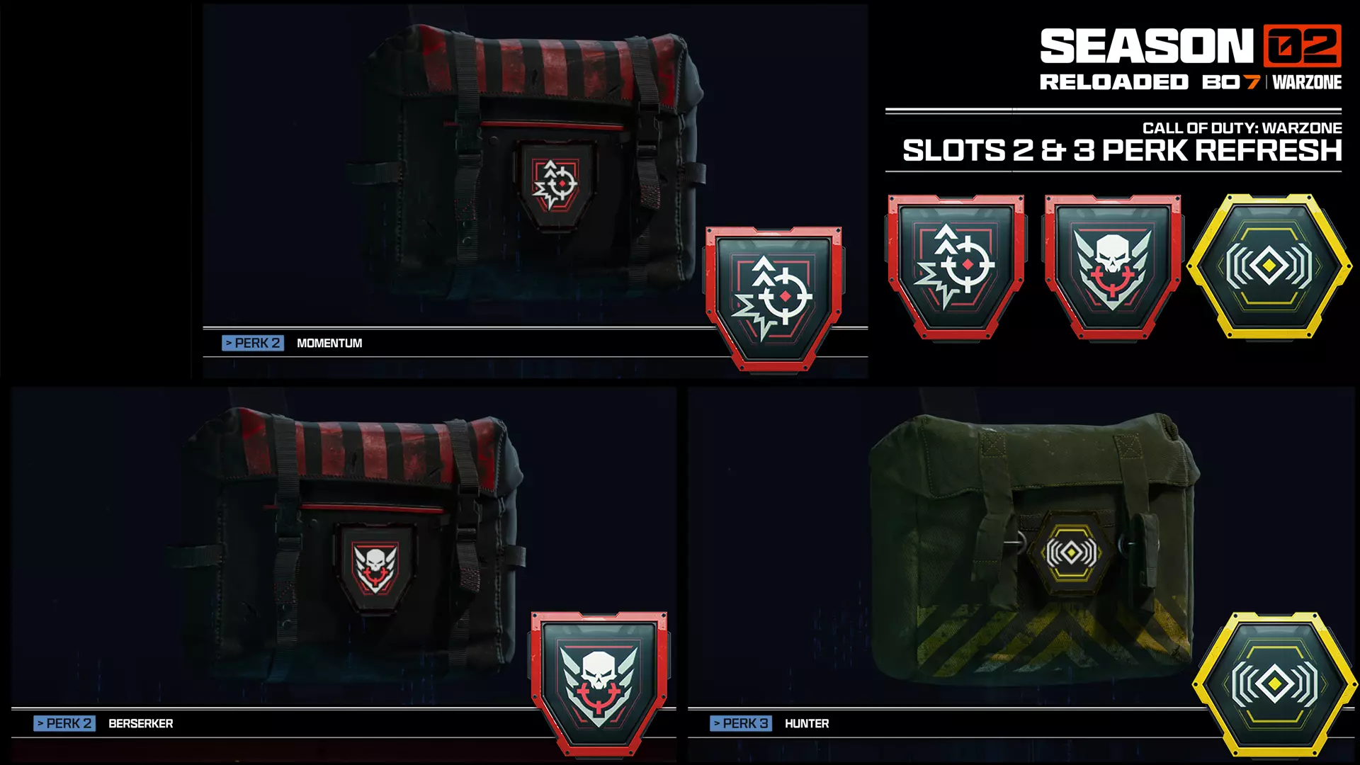 第二赛季重装上阵更新对第二栏和第三栏的三个特长进行了调整,旨在奖励武器持续作战、激进追击以及增强敌人追踪能力。 动量(第二特长栏) 替换警觉 移动强化特长:动量专为在保持移动中生存的近距离作战干员设计。该特长提升了在狭窄空间内的敏锐战斗动作,同时改进武器操控性,以便先发制人并精准追击。 效果包括:提升近距离武器操控性、减少连续跳跃惩罚、减少滑铲开火延迟、降低腰射散布、增加开镜移动速度以及加快蹲伏和卧倒速度。 狂战士(第二特长栏) 替换拆弹小队 移动强化特长:狂战士以敏捷性奖励攻击性。消灭敌方玩家后,获得短暂的行动速度提升效果,让你能在对手做出反应前连续作战并快速调整位置。在此期间,包括使用装备、切换武器、装填弹药、改变姿态和装备护甲在内的常见战斗动作都会显著加快,使你能根据战况灵活应对。 狂战士还能提供更高的击退抗性,帮助你在火力下保持瞄准目标;并且在低生命值时减少视觉阻碍,确保关键时刻的视野清晰。对于喜欢主动发起战斗并在每次消灭敌人后利用 momentum(原词)乘胜追击的玩家来说,这是一个理想的选择。猎人(技能槽3) 取代追踪者 增强感知技能:此技能结合了警觉和追踪者的优势,提升追踪能力、态势感知和敌人侦测能力,帮助你的小队追捕最狡猾的敌人。享受多项战斗强化效果,包括短暂高亮显示被你的子弹击伤的敌人并看到其脚印、感知30米范围内的敌人,以及感知自己何时被瞄准。 此技能专为那些主动狩猎、追踪和预判敌人移动而非被动应对的玩家设计。 额外技能和装备调整 以下调整旨在强化信息作为战略资源的价值,同时保留专注于潜行的技能的价值。幽灵技能调整:该增益将幽灵技能的生效延迟结束时间从1.5秒延长至5秒,让你能更长时间躲避敌方无人机及其他情报收集设备的探测。 周末限时模式