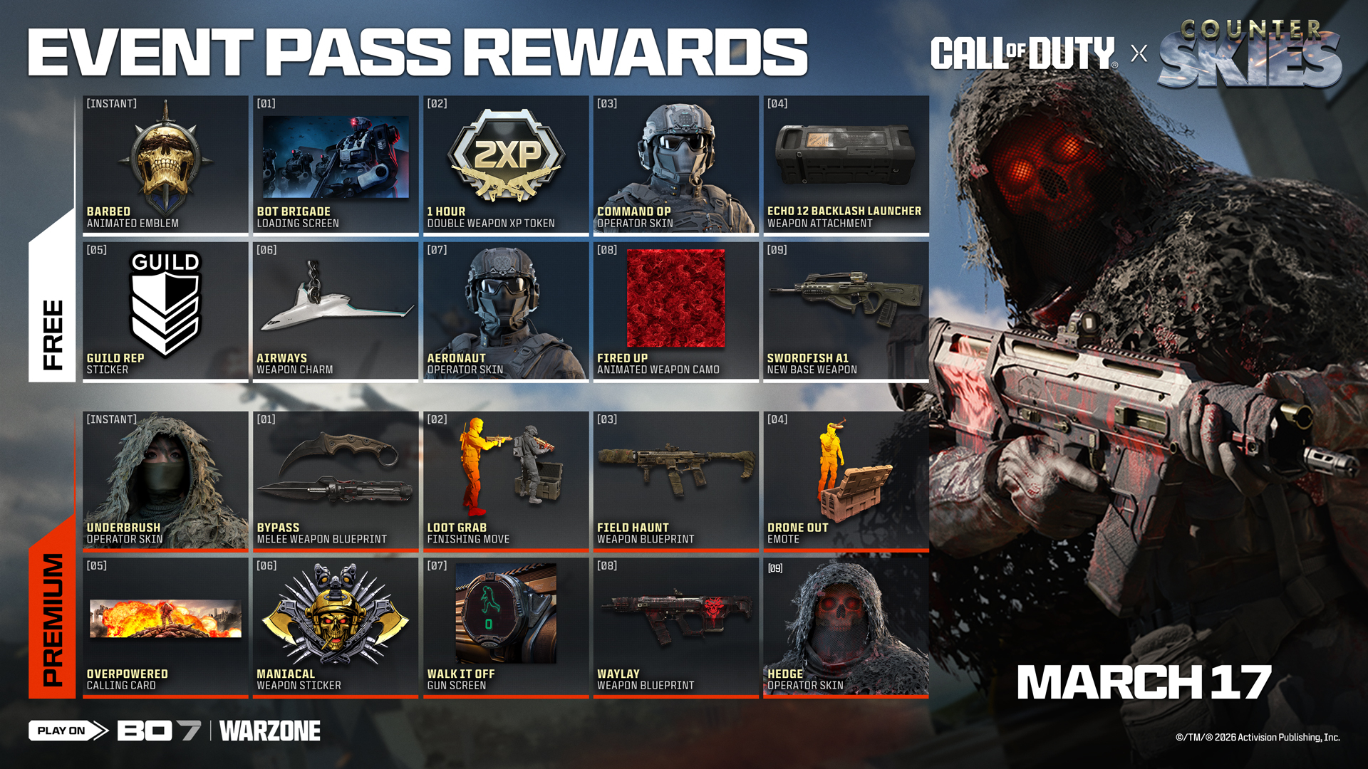 所有模式通用免费奖励线,达成以下经验值里程碑可获得对应奖励: - 1小时2倍经验值 - 【Fired Up】通用武器迷彩 - 【Airways】武器挂饰 - 【Guild Rep】贴纸 - 【Bot Brigade】加载界面 - 【Barbed】徽章 - 【Swordfish A1】精准步枪(基础版) - 【Echo 12 Backlash Launcher】配件 - 【Aeronaut】干员皮肤 - 【Command Op】干员皮肤 购买高级奖励线,即可在免费奖励线基础上额外解锁第二条奖励线,尊享以下高级奖励,制霸天空: - 【Walk it off】枪械屏幕 - 【Maniacal】武器贴纸 - 【Overpowered】动态名片 - 【Drone Out】表情 - 【Loot Grab】终结方式 - 【Field Hunt】RK-9SMG武器蓝图·弹道刀“绕路”武器蓝图·“树篱”干员皮肤·“灌木丛”干员皮肤·“伏击”DS20幻影突击步枪武器蓝图 活动:排位系列活动(多人模式) 奖励包括:徽章、武器迷彩