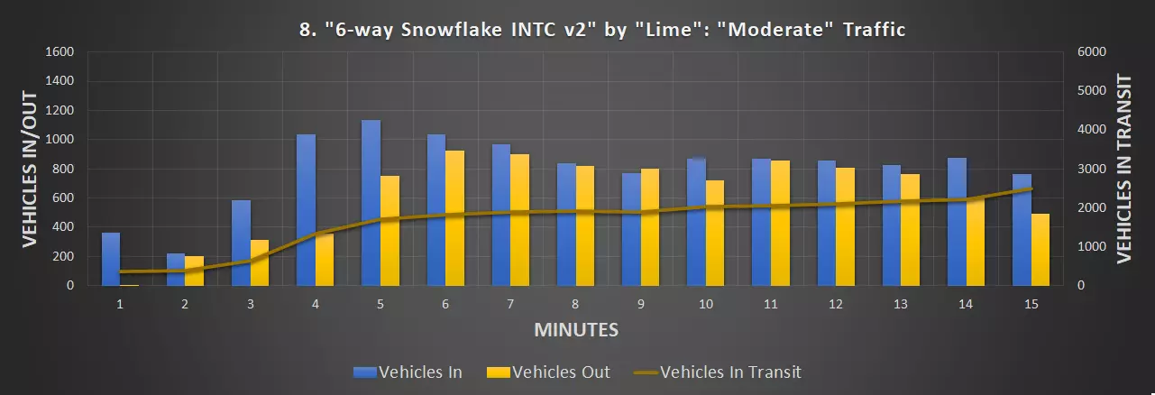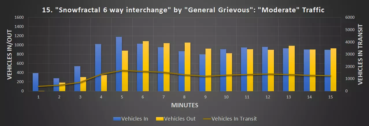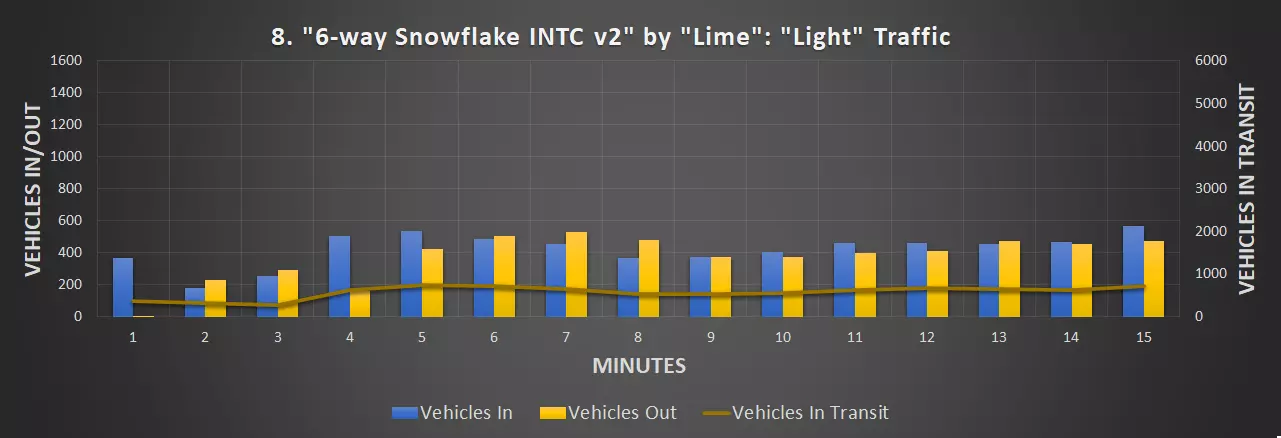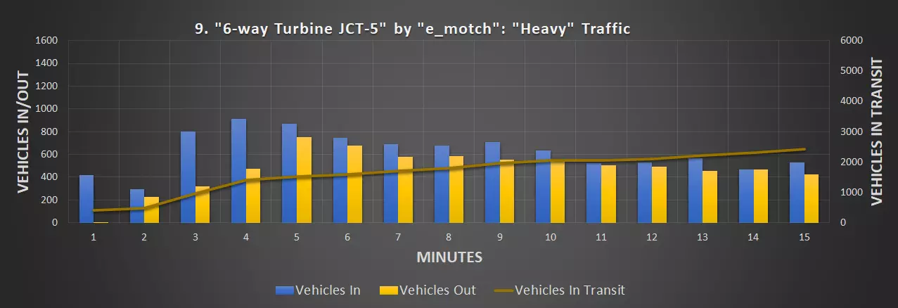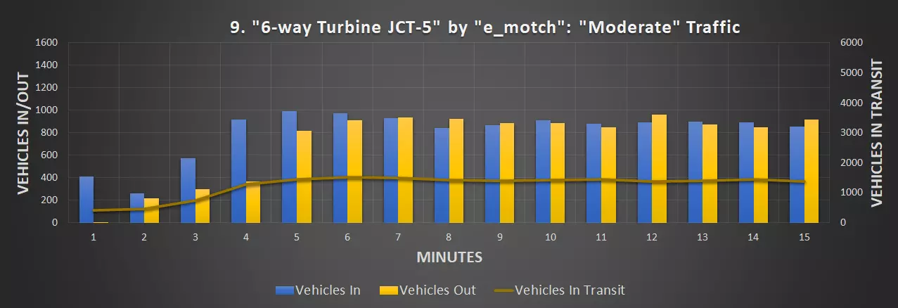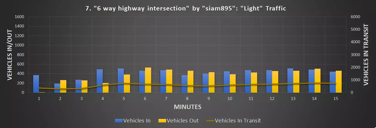 视频:0:09 尺寸:20×20 成本:4800 等级:1 道路:6车道城市道路 峰值每分钟车辆数:351辆/分钟(轻度交通),430辆/分钟(中度交通)