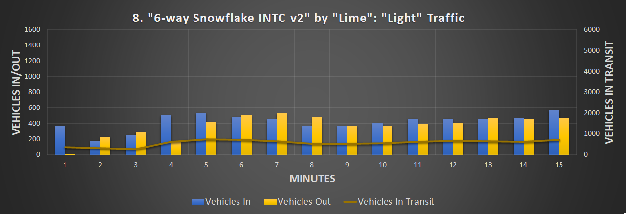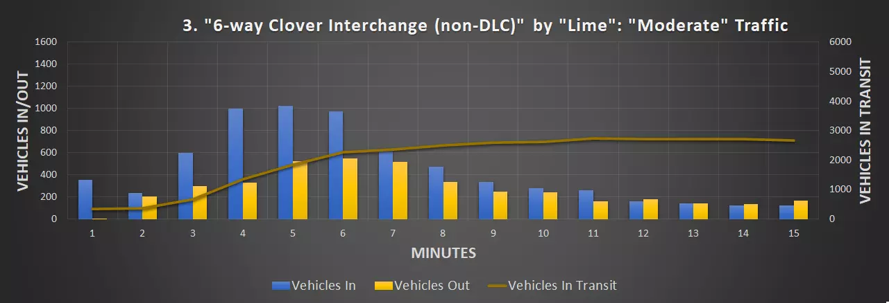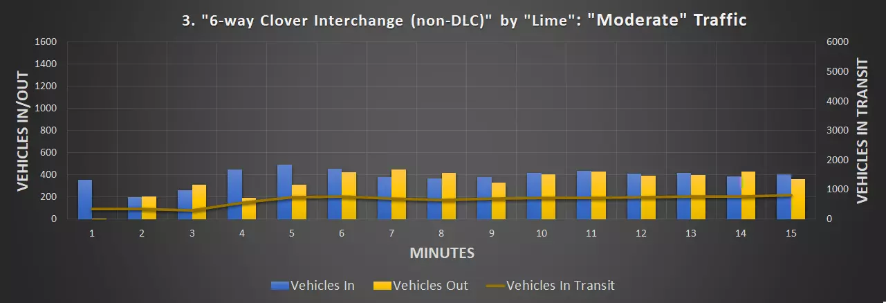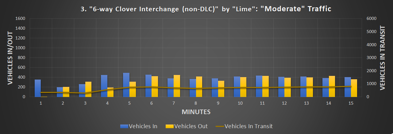 制作过程 为了制作这段视频,我使用了由Colossal Order和Paradox Interactive开发的《城市:天际线》。我还需要使用“大众运输”模组、“网络扩展2”DLC、“交通管理器:总统版”(TMPE),以及一个我自己编写的用于统计车辆数量随时间变化的小型自定义模组。 前8个十字路口是在轻度和中度交通流量下录制的,后7个则是在中度和重度交通流量下录制的。 我使用TMPE来管理所有十字路口的车道合并。对于部分十字路口,车道合并的选择很明显,但对于其他一些路口,则需要多次尝试才能平衡合并需求。从图表中可以看出,为四车道及更宽高速公路设计的交叉路口在交通流量方面具有优势,它们能够处理更多的交通。我不能将这些交叉路口的入口/出口限制为三车道高速公路,因为它们在设计时并未考虑在这些区域设置额外的瓶颈。因此,三车道高速公路和四车道高速公路的交通流量情况略有不同。我已尽可能使它们相似,但无法直接进行比较。 1. 定时交通灯
