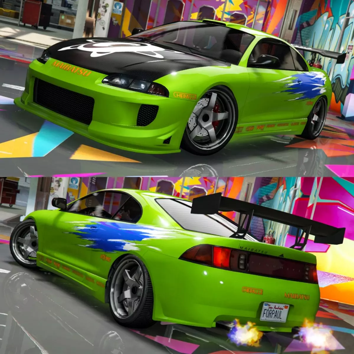 以下将展示《侠盗猎车手Online》中出现的车辆,并非所有带加力燃烧室的车辆都在游戏内。 列表: 1. 1995 三菱 日蚀 2G 2. 丰田 Supra 速度与激情2 1. 日产 Skyline GT-R R34 2. 三菱 Lancer Evo 7 3. 雪佛兰 Camaro Yenko/SC 复刻版 1969 速度与激情4 1. 日产 Skyline GT-R R34 2. 斯巴鲁 Impreza WRX STI 2009(未在游戏内) 速度与激情5 1. 道奇 Charger SRT8 速度与激情6 1. 日产 GT-R R35 2. 福特 Escort MK1 RS1600 速度与激情7 1. 斯巴鲁 Impreza WRX STI [GH](未在游戏内) 2. 日产 GT-R R35 3. 丰田 Supra 速度与激情 1995 三菱 日蚀 2G 电影: