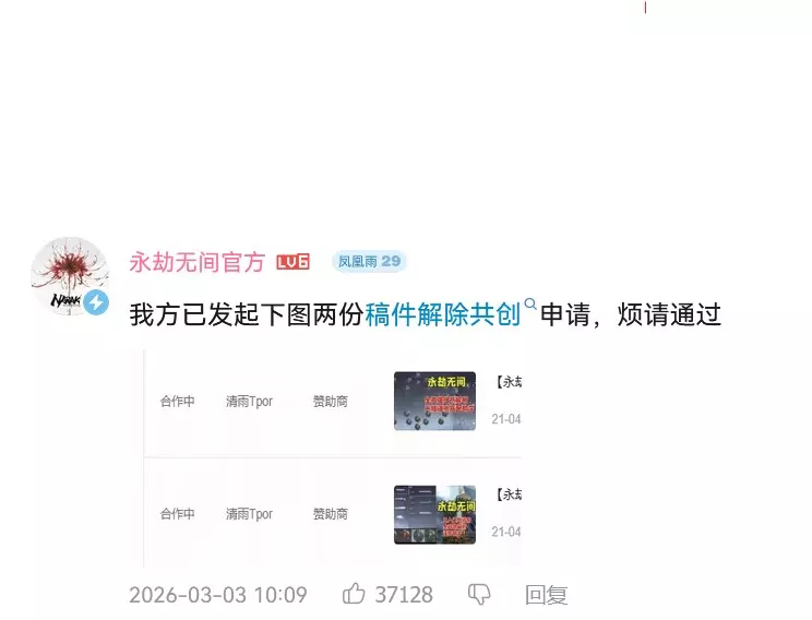 永劫无间官方也在之前的合作视频【【永劫无间】从入门到进阶,全武器解析连招教学】底下发布评论,公开宣布与【清雨Tpor】划清界限。 永劫无间官方:"我方已发起下图两份稿件解除共创申请,烦请通过"