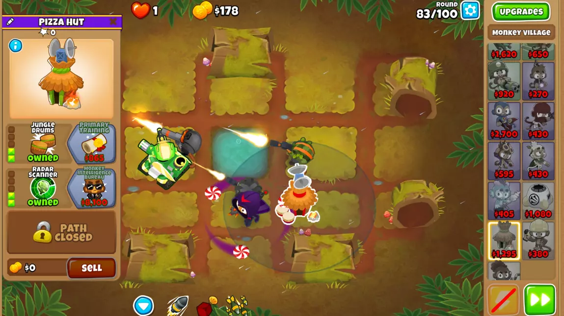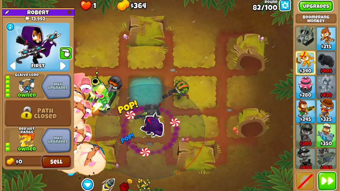步骤10:在中间的狙击手猴子下方放置一个回旋镖猴子。到第83回合时,将其升级为5-0-2。它将有助于对抗DDT。