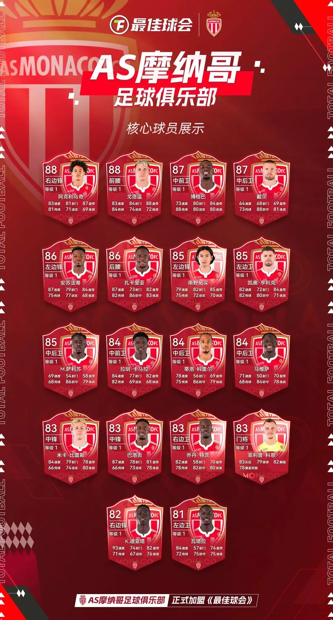 1924年8月24日,摩纳哥足球俱乐部正式诞生。1933年,摩纳哥接受法国足协邀请,加入法国足球联赛体系。从此,开始了“在法国踢球的外国球队”这一独特旅程。1960/61赛季,摩纳哥第一次穿上由摩纳哥王妃格蕾丝·凯莉亲自设计的红白对角条纹球衣。那一年,他们夺得了队史第一座法甲冠军。