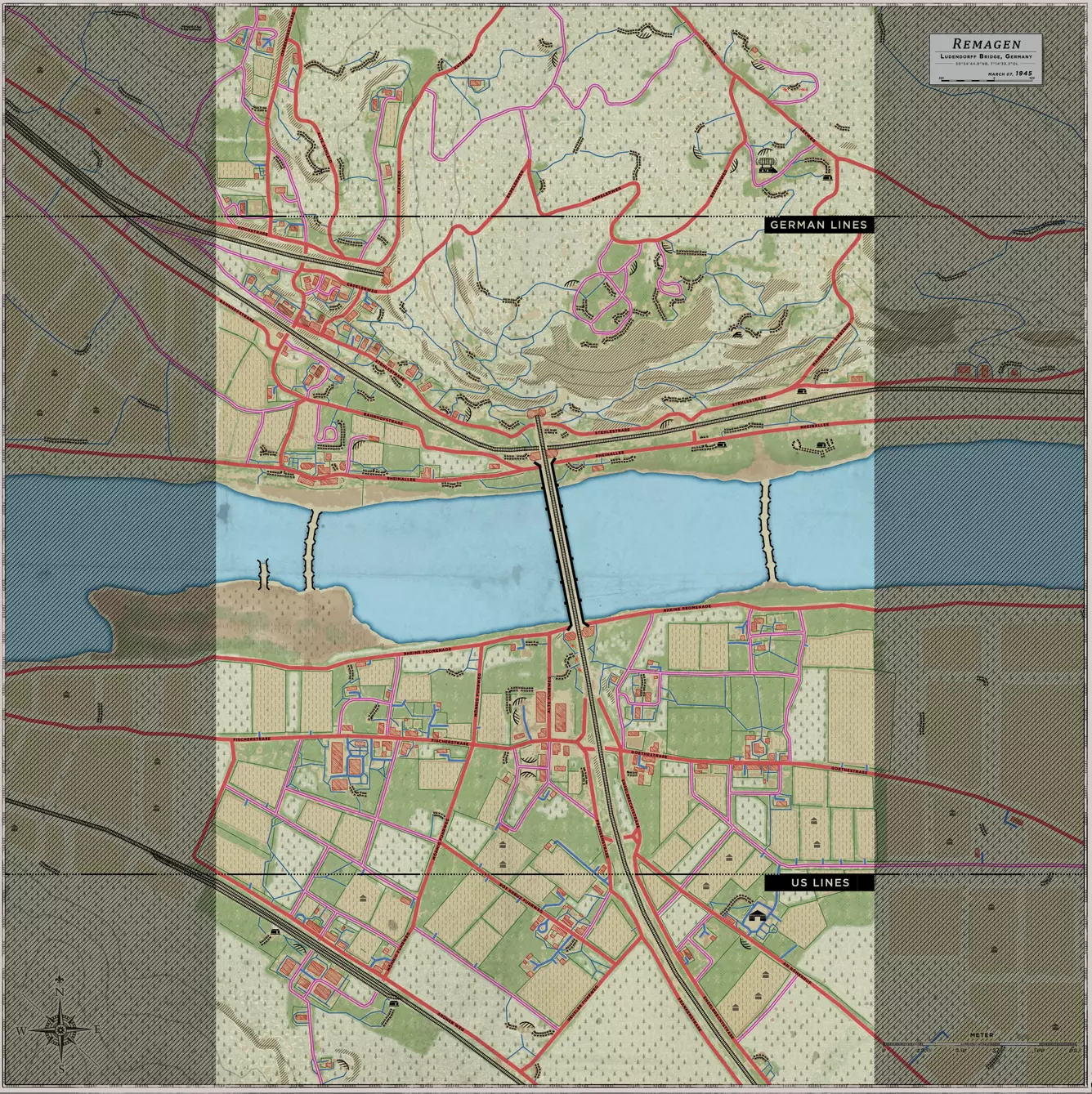 雷马根 东部渡口更新 额外的河流渡口 关于雷马根地图,最常见的反馈之一是过度依赖中央桥梁作为唯一可行的过河路线。 为减少这一瓶颈并创造更多侧翼包抄和机动的机会,地图现在沿河增设了额外的渡口。 这些新渡口旨在为步兵和车辆提供跨越莱茵河的替代路线,帮助缓解桥梁周围经常形成的激烈拥堵点。 鲁登道夫大桥仍将是地图的关键焦点,但双方队伍在尝试过河时现在将有更多战略选择。