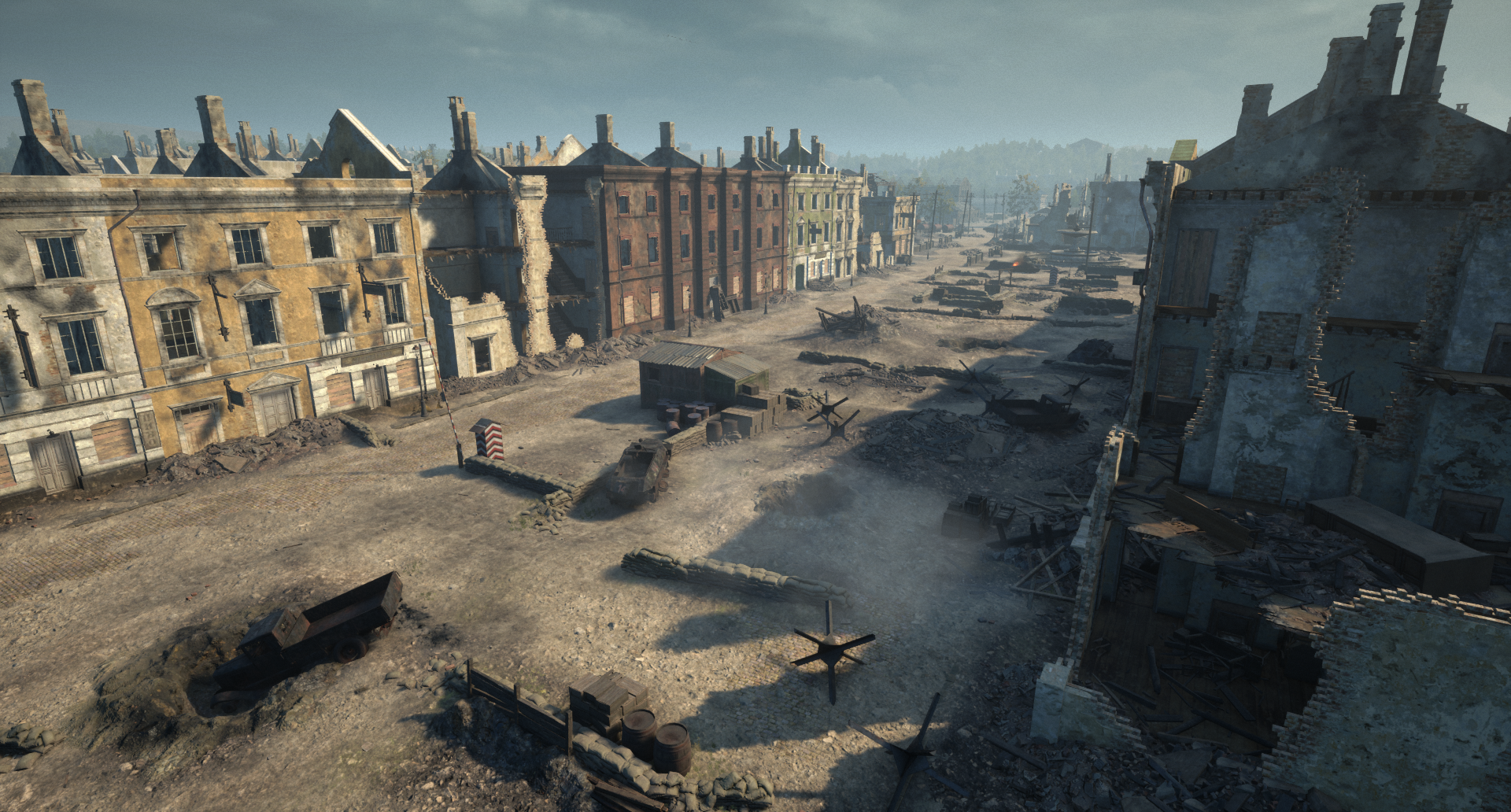 莫斯科街 斯摩棱斯克市中心以东,道路开阔形成这条两旁是住宅楼的宽阔街道。这个【占领点】会持续爆发激烈的城市战斗,但穿越开阔街道会带来额外风险。这里有充足的掩护,包括被摧毁的电车。车辆仍能在该区域通行,不过它们会更容易暴露在周围建筑物内的步兵面前。