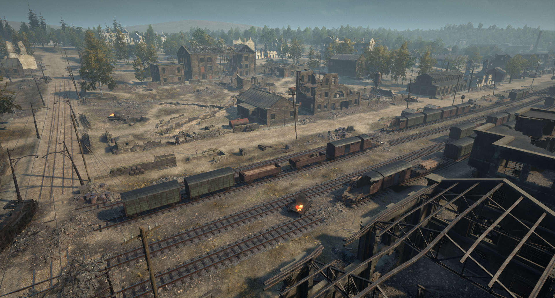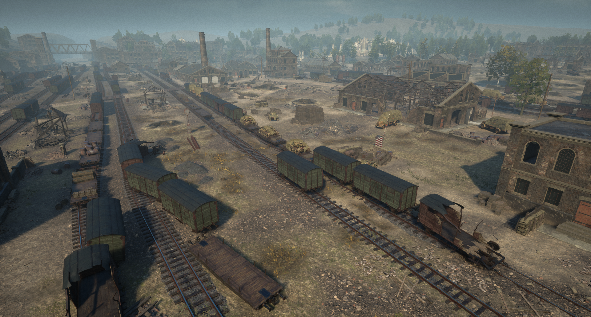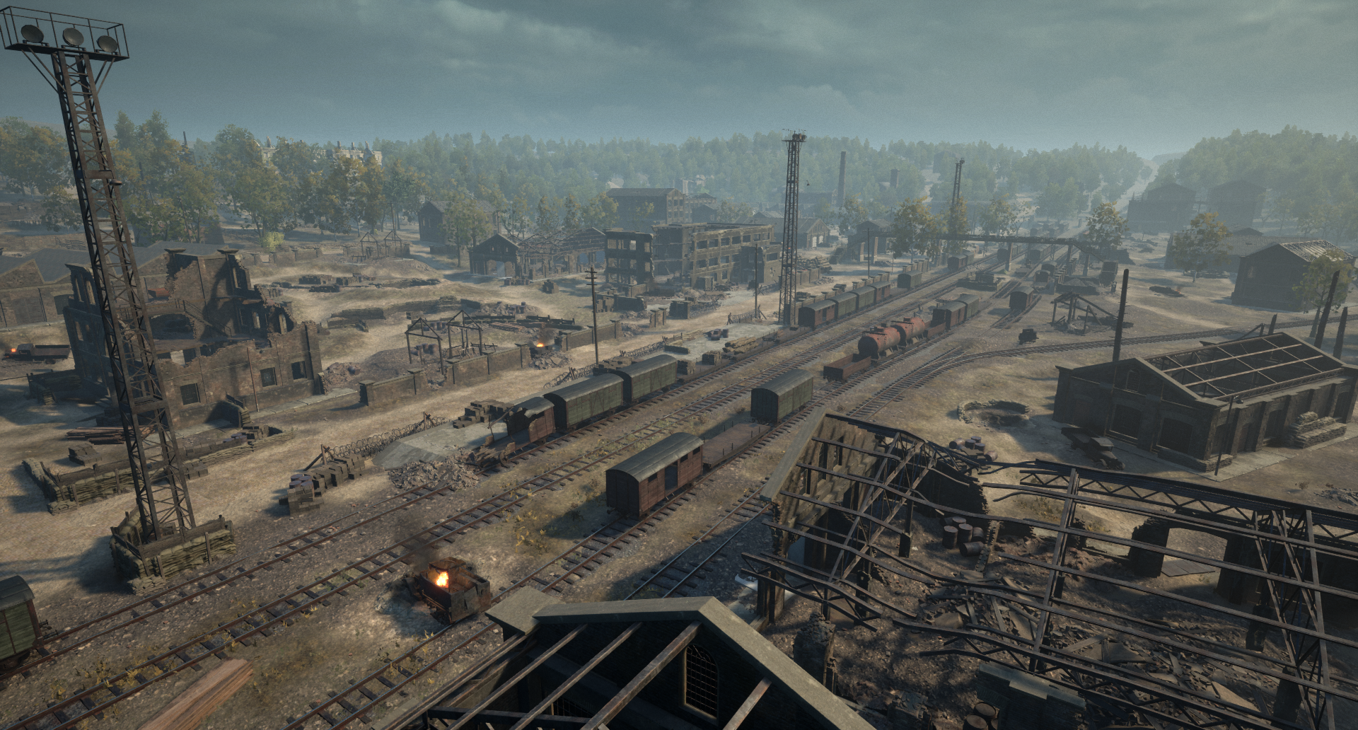 铁路货场仓库 靠近苏联指挥部的地方有一片区域,曾用于存放通过铁路运输的物资。玩家需要在 rail cars(铁路车厢)之间穿梭,沿着火车轨道前进。这个争夺点还设有一座严重损毁的军官大楼,玩家可以进入这座废墟建筑的多个楼层。