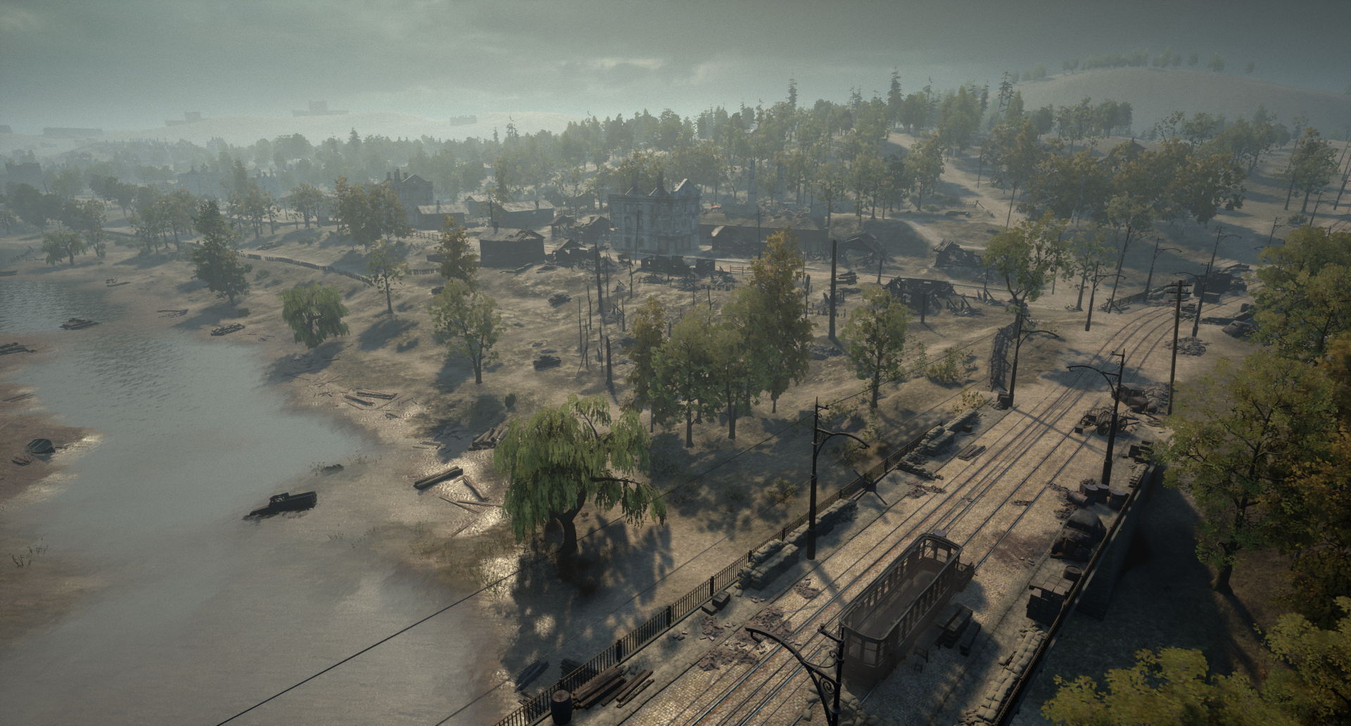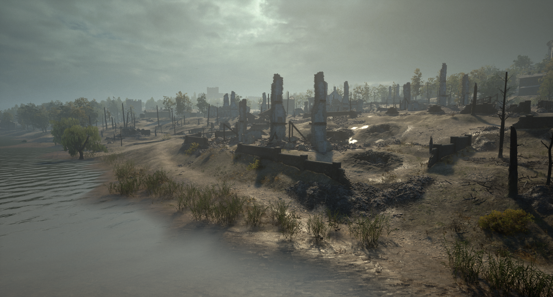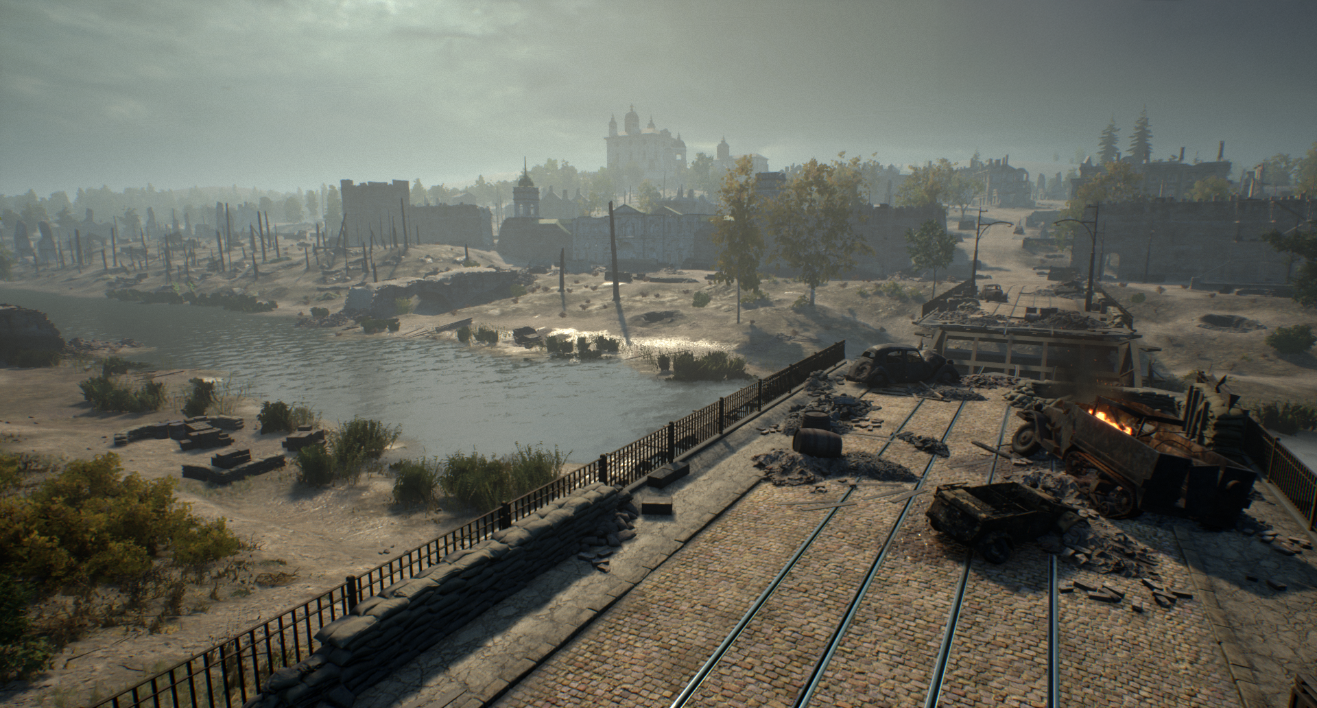 轰炸后的河畔 地图东南部是一片居民区的残骸,在多年的占领期间遭到猛烈轰炸。如今这里已是一片废墟,玩家可以利用瓦砾堆成的建筑作为掩护,抵御来自河对岸的攻击。这个占领点凸显了斯摩棱斯克在战争期间所遭受的破坏程度。