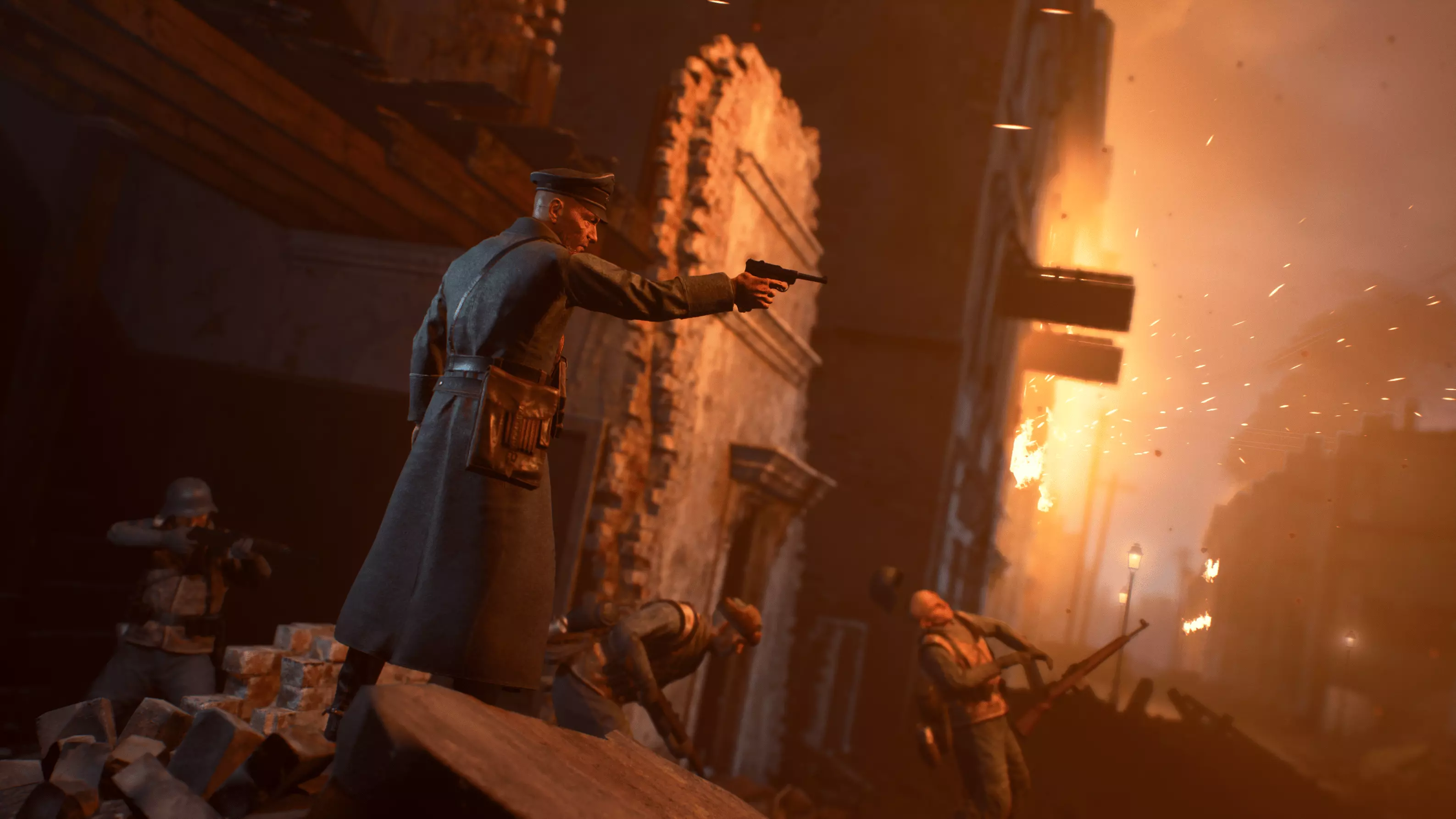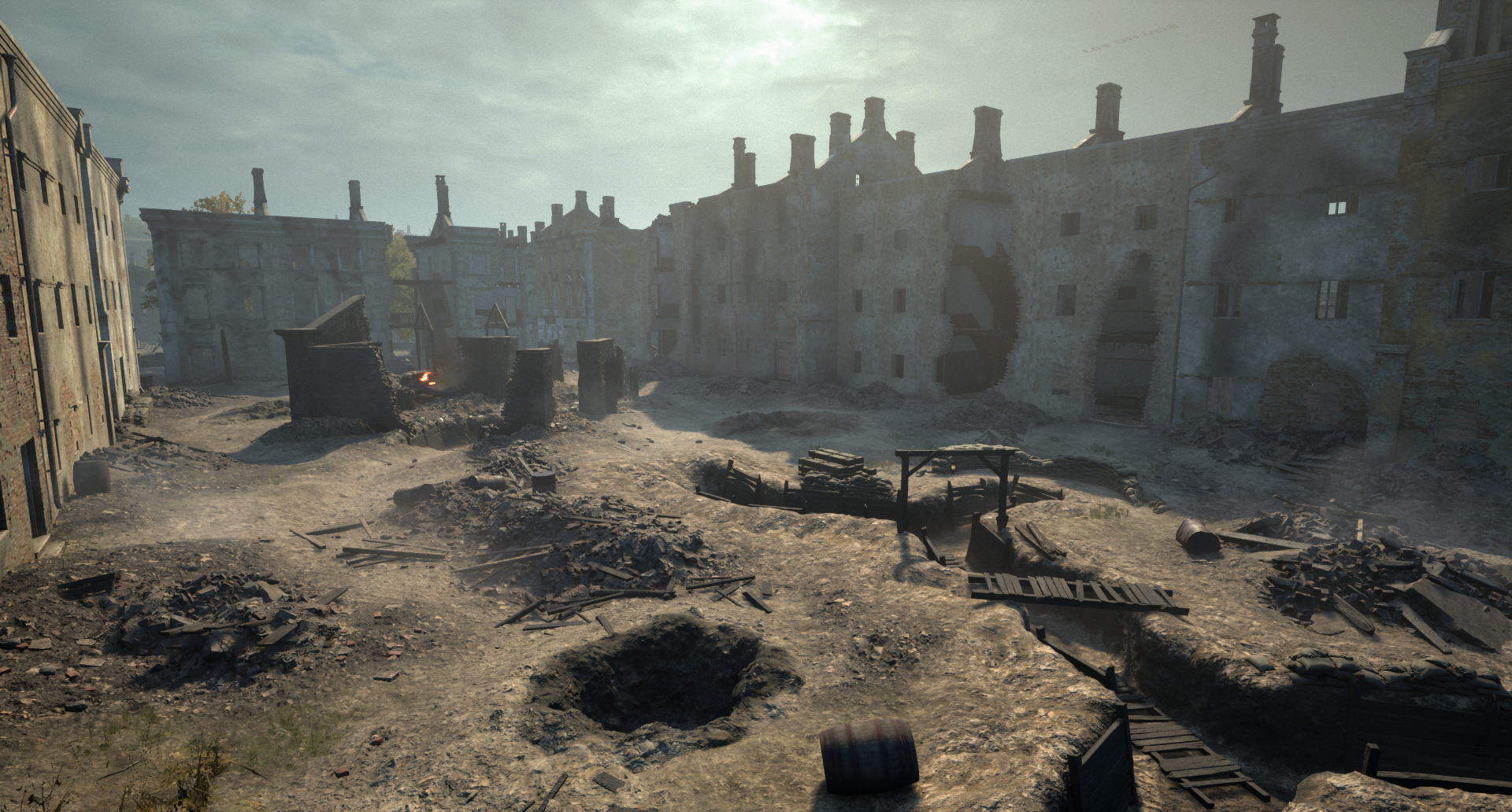 斯摩棱斯克氛围 斯摩棱斯克地图的视觉氛围得到了重大升级,重点是在严格控制性能消耗的同时提供高质量的视觉体验,尤其是在主机平台上。第一步是优化夜间地图的火焰视觉效果。 由于所需火焰的频率问题,之前在斯大林格勒使用的大规模火焰技术无法直接应用于斯摩棱斯克。为此开发了一个更精简的系统,能够在不影响性能的前提下,为特定建筑添加额外的火焰效果。 核心火焰效果已重新设计,现在主要采用双卡片渲染技术,该技术最初用于斯大林格勒的大规模火焰,但针对斯摩棱斯克进行了优化。这使得火焰能够呈现出逼真的动态、摇曳效果以及热扭曲,而无需依赖大量独立且计算成本高昂的粒子。其结果是显著减少了过度绘制和粒子数量,从而允许多栋建筑同时出现火焰效果。 这一优化还使得添加余烬和灰烬等辅助粒子效果成为可能,在不影响性能的前提下增强了游戏氛围。环境雾体积已更新,在烧焦的街道上营造出热 glow 效果(原词:heat-glow),同时采用低成本照明方法以保持效率。基于距离的剔除技术进一步确保了这些效果不会对性能产生影响。还实现了远处的火焰效果,玩家可以从周围的山丘上看到城市燃起熊熊大火,增加了战场的规模感和沉浸感。 除了对夜间地图进行的大量优化外,白天地图也进行了氛围调整,新增了雾效体积,在被炸毁的建筑物周围营造出更局部的雾气和阴霾。