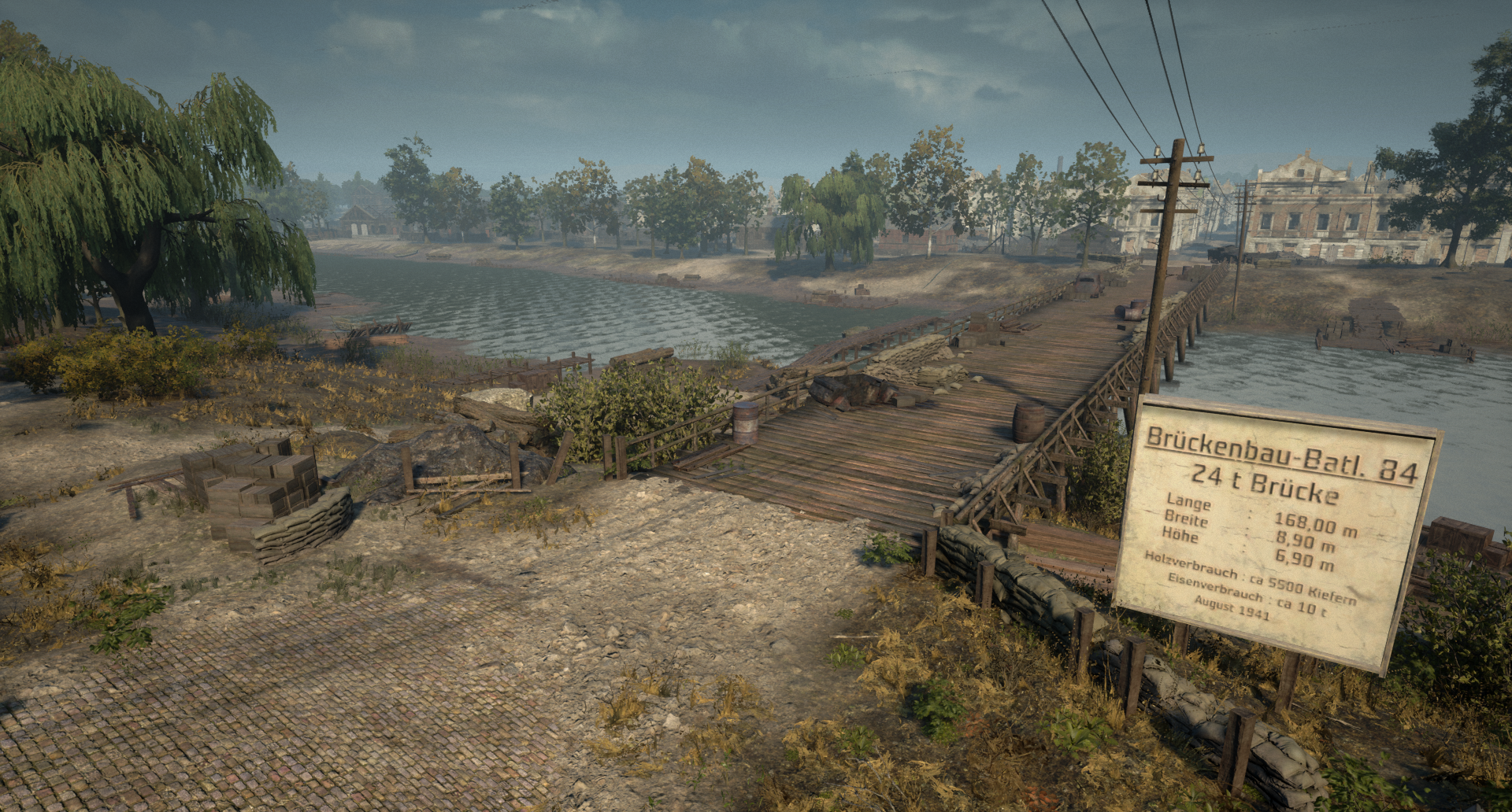 第84营大桥 随着第聂伯河上的主桥被毁,德军搭建了一座临时桥梁用于运输物资和人员过河。玩家必须利用河流周围散落的掩护物来保护自己免受炮火攻击。与斯摩棱斯克的所有桥梁一样,车辆可以轻松通过这些桥梁。