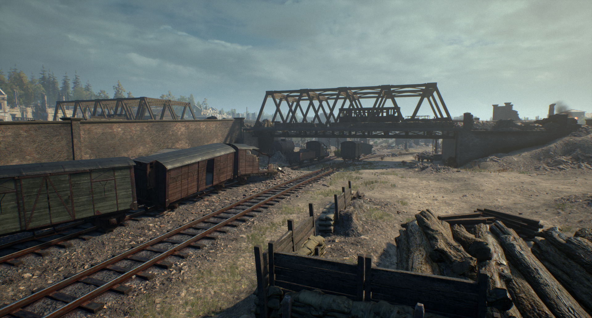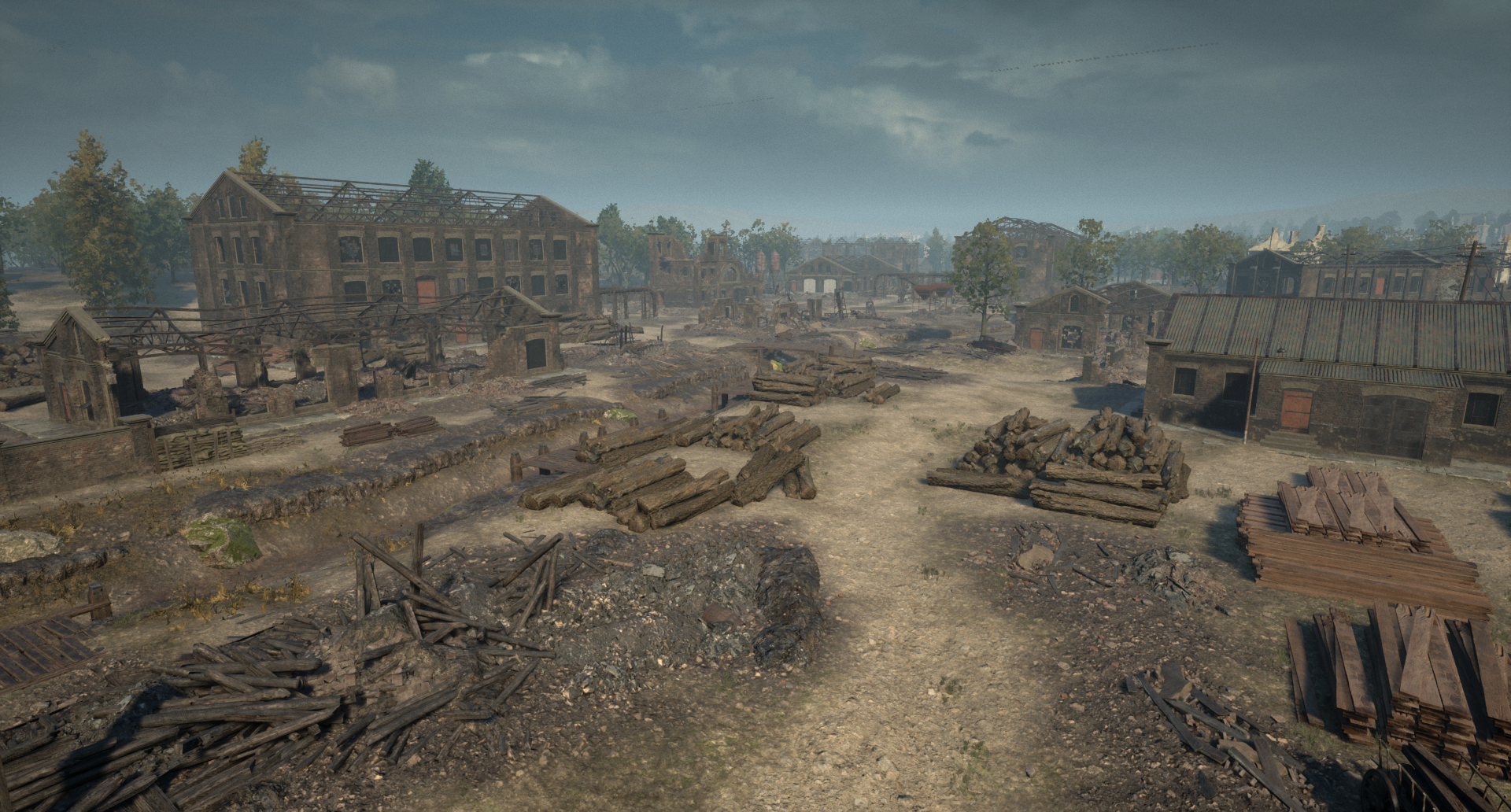 伐木场 历史资料显示,斯摩棱斯克的这片区域曾有一个大型伐木场。防守这个【占领点】的玩家必须穿梭于木材堆、废弃仓库和干涸的小溪之间。该伐木场在斯摩棱斯克防御战中起到了关键作用,德军利用这里储存的木材在城市各处建造桥梁和防御工事。