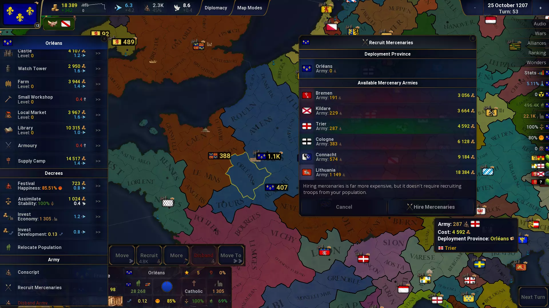 招募雇佣兵 雇佣雇佣兵的成本要高得多,但无需从你的人口中招募士兵。