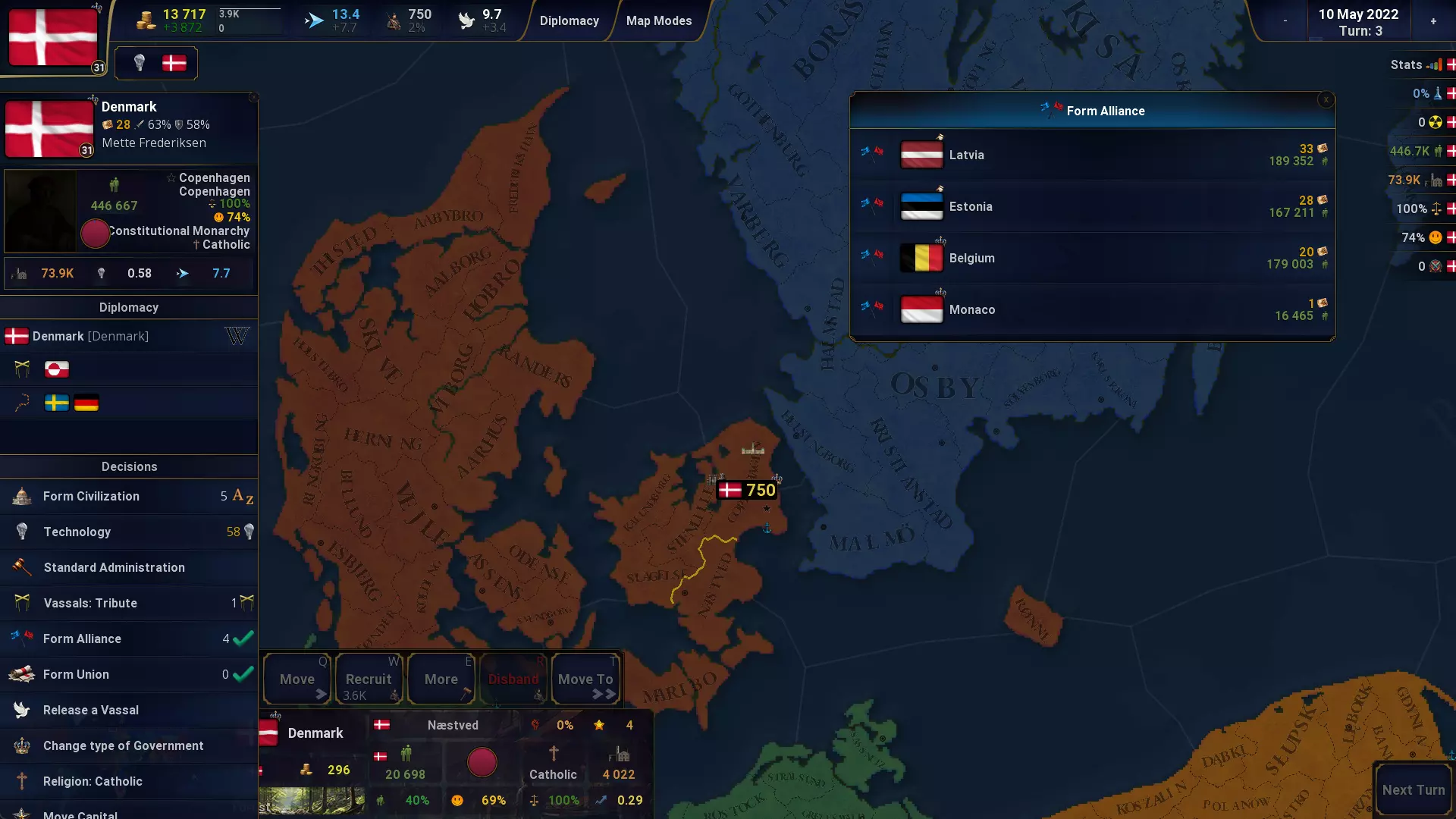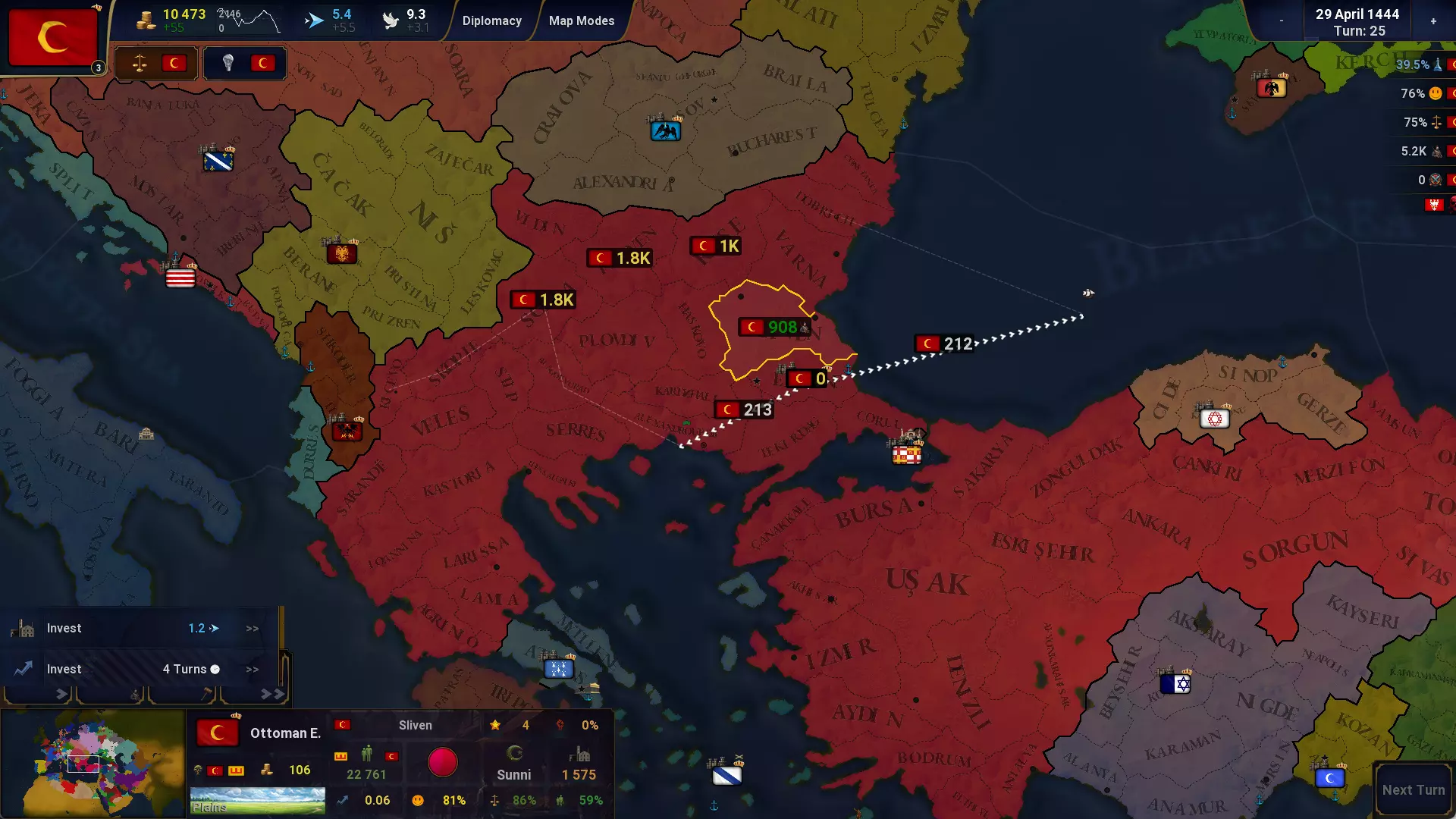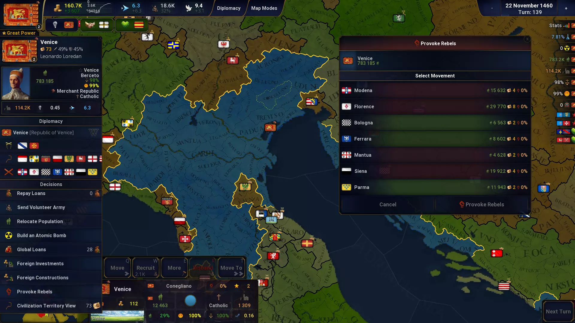 省份与经济管理 重制的省份信息菜单。 右键可切换外交视图。 右键点击国库按钮可打开贷款菜单。 省份批量操作:可立即执行以下操作 同化 举办庆典 进行投资 稳定性、幸福度和军队位置的快速概览面板。 省份中的【更多】菜单:包含快速建造、同化、投资、组织庆典功能。 地图模式现在包含用于常见省份任务的快速操作按钮。 使用A、S、D、F键可分别招募省份中25%、50%、75%、100%的军队。 省份信息会显示收入(税收和生产)减去行政成本后的数值。 首都有小概率初始拥有农场、市场、工坊或图书馆。
