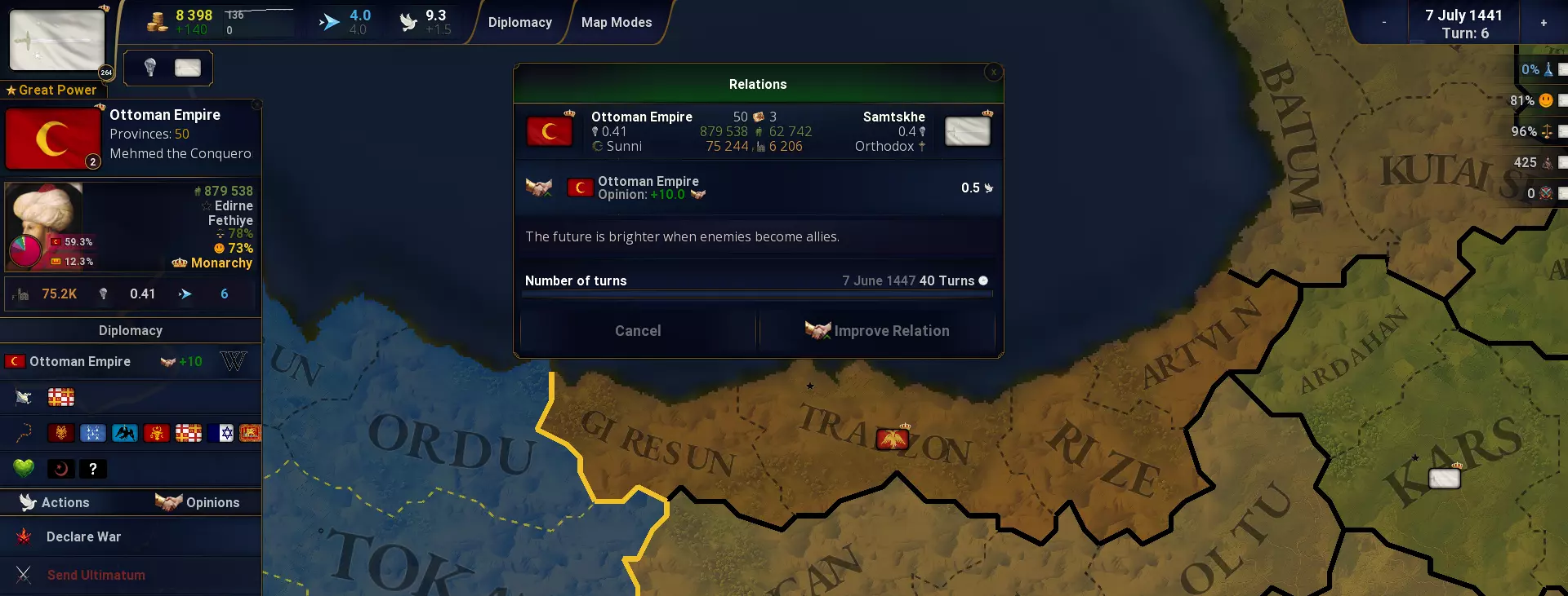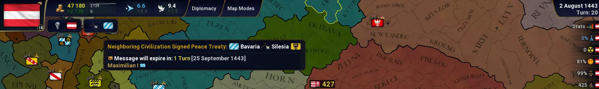 游戏玩法特色与便利性优化 - 移动点数最多可累积至默认值的150%。 - 场景选择菜单现在包含预览图片。 - 支持具有多张背景图片的地图。 - 新增配置选项:地图缩放系数(MapScaleExtra):1.0,允许在不增加省份大小的情况下缩放地图。 - 在外交界面中,【提议结盟】按钮会显示结盟提议是否会被接受。 - 许多悬停元素现在会显示更多信息,并改进了视觉效果。 - 在收入地图模式和建造工坊时,列表将保持原位,不会返回顶部。 - 即使打开【更多/建造】菜单,省份行动菜单仍会保持可见。 - 即使打开文明信息或外交菜单,省份行动菜单仍会保持可见。外交界面方面,点击外交按钮将在排名视图中显示该按钮对应的所有文明。 游戏平衡性调整: - 黄金时代军事相关调整。 修复内容: - 修复了文明视图中人口和经济数值的32位整数溢出问题。 - 国库文本在超过100万时将显示更简短的形式,玩家可在游戏数值设置中修改此限制。 - 游戏现在会保存玩家上一回合的战斗报告,以便玩家再次查看,这对错过重要战斗的玩家很有帮助。 - 只有在发生战斗时才会显示战斗报告,若没有防御方则不会出现。 - 部队在敌方领土击败叛军后不再会倒戈。 新增内容: - 新增世界经济及各大洲经济统计菜单。在联盟菜单中新增了修改联盟名称及其颜色的功能。 战争赔款的持续时间调整为18回合,收入百分比提升至12%。 港口提供的收入加成从2%提高至5%。 变更政府类型会使所有省份的幸福度降低10点。 叛军的防御加成从2%提升至8%。 AI将不再掠夺其拥有核心的省份。 当前战争将按大陆进行排序。 新的政府类型变更菜单会显示每种政府类型的所有统计数据。