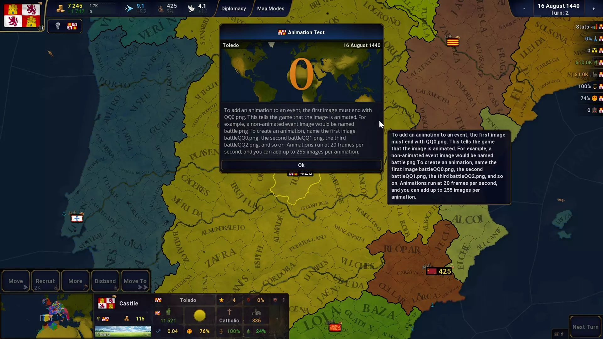 事件 为剧本事件新增弹出时播放音乐的选项。 修复【控制省份】事件的触发条件。 修复事件起始日期未设置时无法运行的问题。 事件数据已标准化,但部分来自AoH2的事件可能无法在AoH2:DE中使用。 事件动画 现在可以创建带有动画的事件。 要为事件添加动画,首张图片的文件名必须以QQ0.png结尾,以此告知游戏该图片为动画。 例如,非动画事件图片可命名为battle.png。 若要创建动画,需将首张图片命名为battleQQ0.png,第二张命名为battleQQ1.png,第三张命名为battleQQ2.png,依此类推。在剧本编辑器中,事件图片应命名为battleQQ0。动画以每秒20帧的速度运行,每个动画最多可添加255张图像。