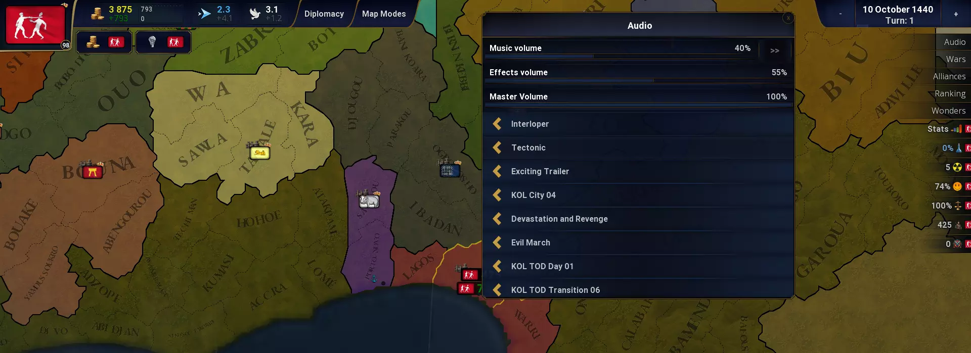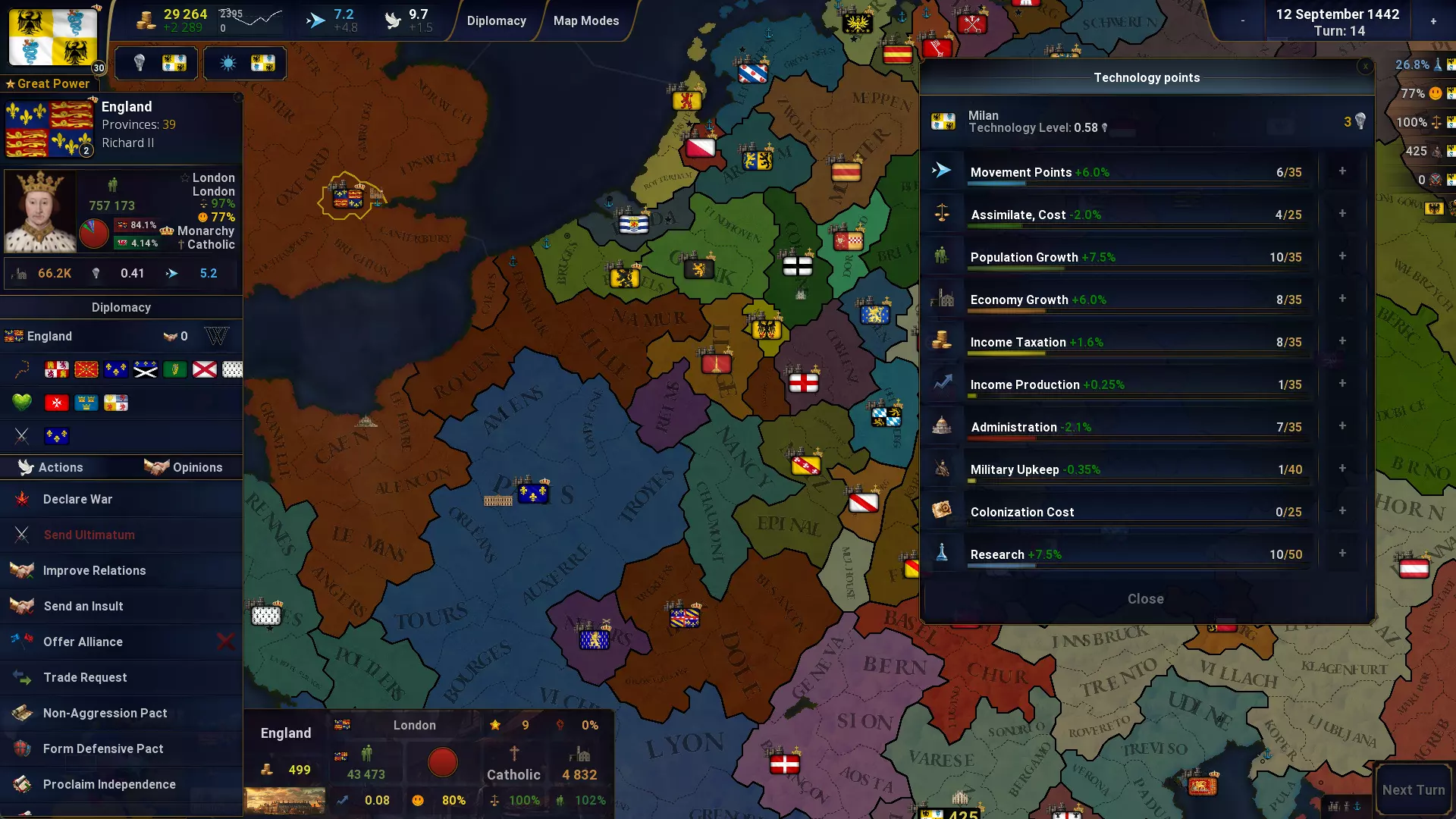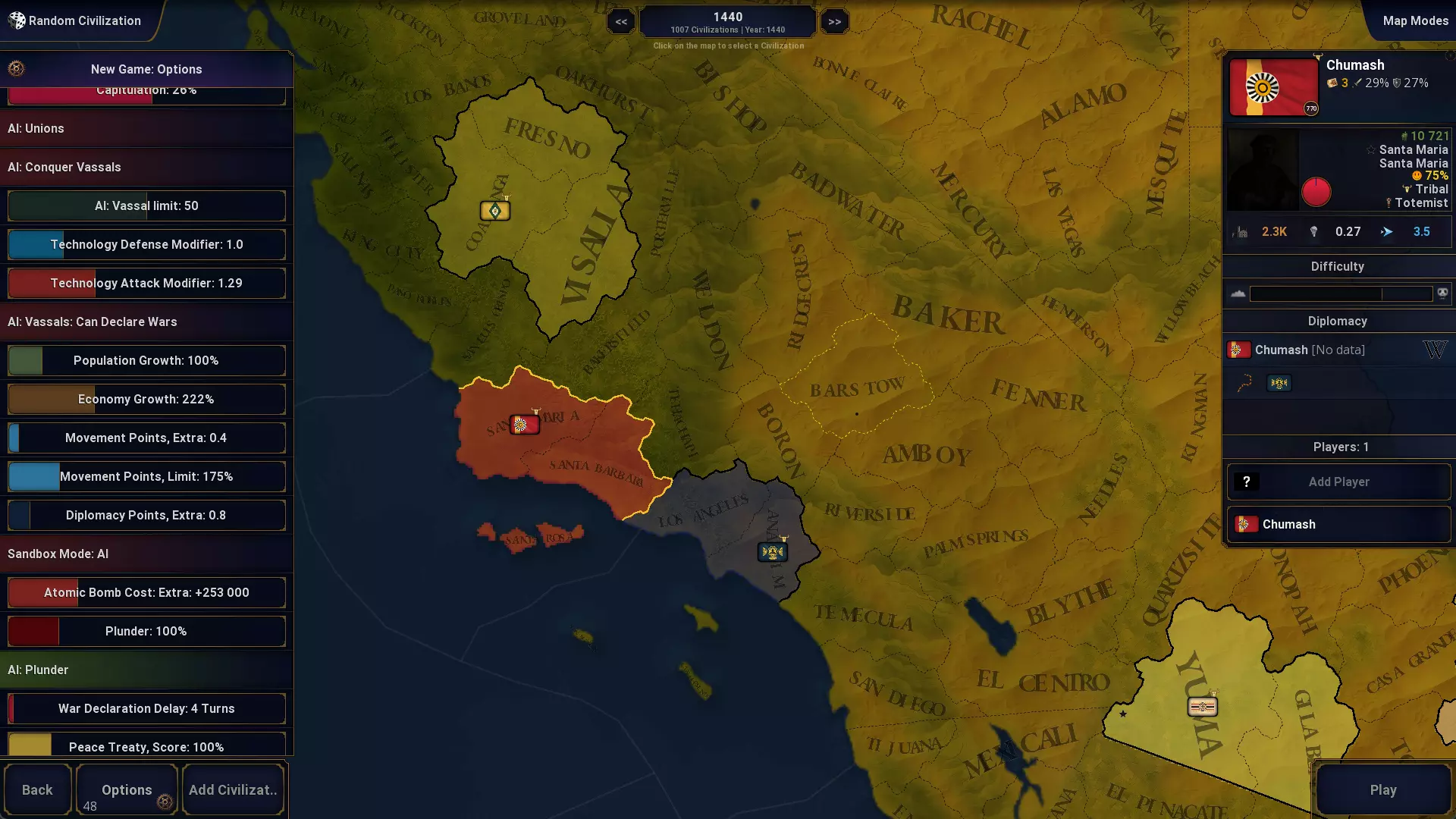 军队撤退:战败军队撤退到相邻省份的百分比。 AI控制军队:启用/禁用。AI可控制军队并在战争期间进行军队招募。 科技:科技点数可用于增加每回合的移动点数。科技点数可用于降低同化成本。科技点数可用于增加所有省份的可招募人口。现在可分配更多科技点数。可以查看每个文明的科技点数分配情况。研究新技术时,所有省份获得+1幸福度。