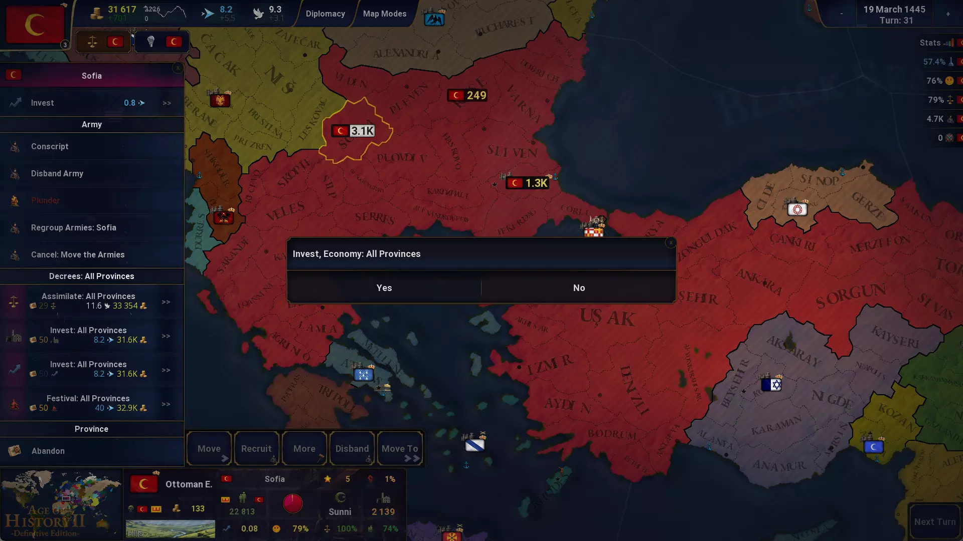 右键省份操作 右键点击省份信息菜单中的特定按钮可快速执行操作: 经济按钮 -> 立即投资经济 发展按钮 -> 立即投资发展 幸福度按钮 -> 立即举办庆典 稳定度按钮 -> 立即同化省份 额外军队管理选项 将所有军队移至一个省份 - 立即命令你所有的军队移动到选定省份。 取消所有军队移动 - 立即停止所有进行中的军队移动