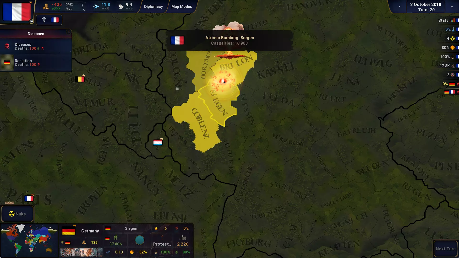 原子弹/核武器 已新增原子弹。 要建造原子弹,文明必须达到特定的科技水平。 建造需要X回合,具体取决于该文明已拥有的核武器总数。 建造费用为Y金币,随着科技进步,费用会降低。 科技水平会限制一个文明可建造的核武器数量。 核武器只能用于攻击处于正式战争状态的文明。 投放核武器会对人口、经济和军事力量造成伤亡。