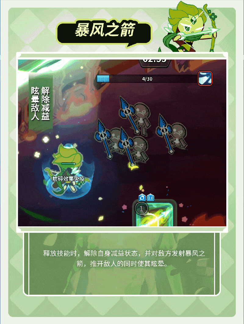 释放技能后解除自身减益状态,对敌方发射暴风之箭,推开敌方并使其眩晕,后续每次攻击均会对敌方发射追风者之箭,对命中敌人赋予风之痕迹与追风者减益效果,当追风者减益效果达到最大叠层时会对目标及周边敌方造成爆炸伤害,每次发射追风者之箭时会赋予自身暴风增益。当变身结束时对敌方发射最后之风,最后之风会根据自身暴风层数对敌人造成额外伤害,同时将敌人困在旋风当中。风箭手饼干进入战斗时可增加自身最大生命值。