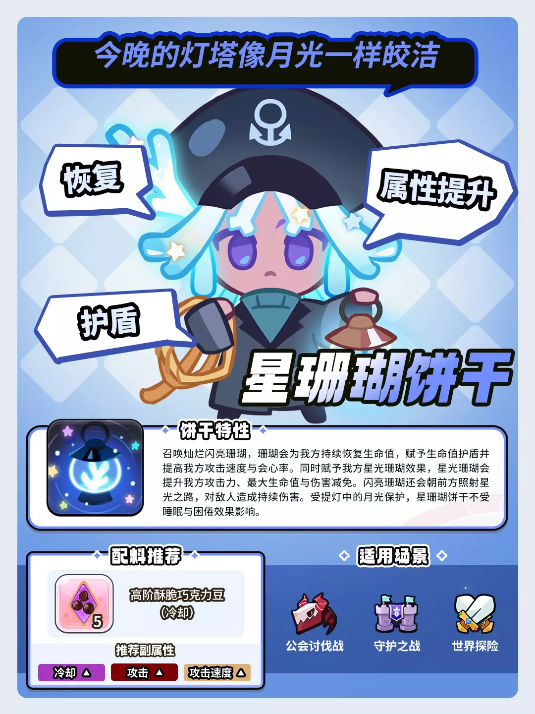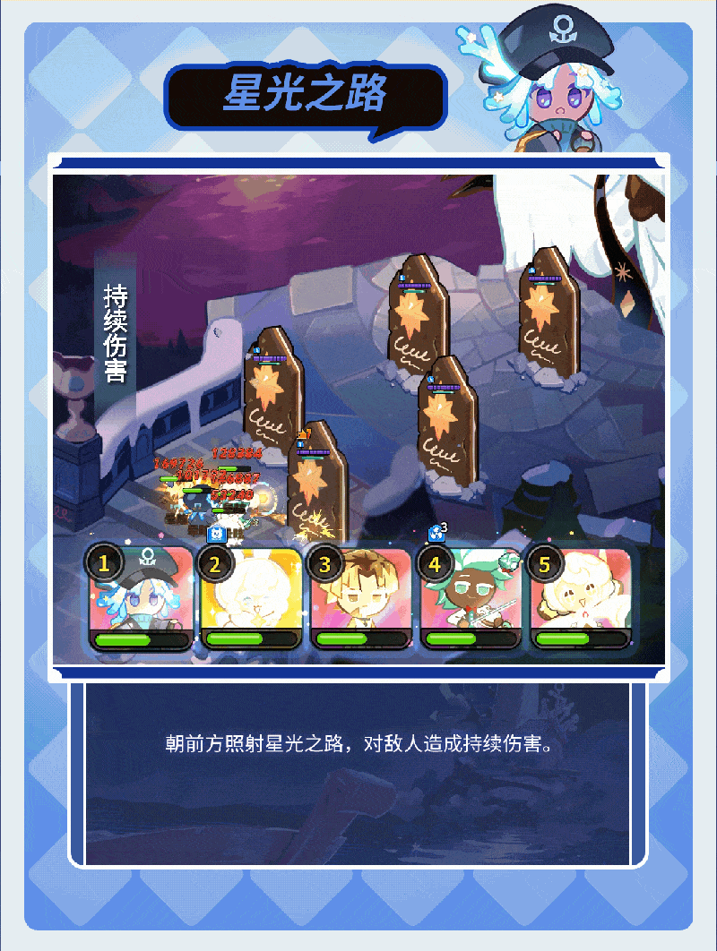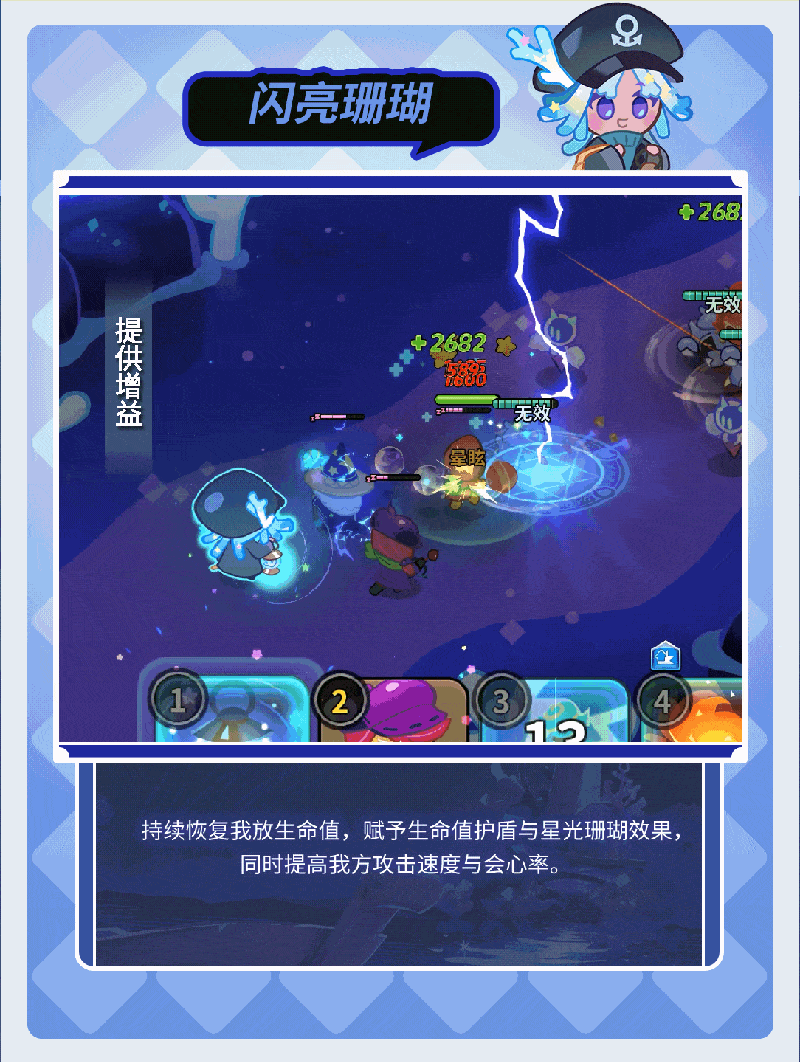 召唤灿烂闪亮珊瑚,珊瑚会为我方持续恢复生命值,赋予生命值护盾并提高我方攻击速度与会心率。同时赋予我方星光珊瑚效果,星光珊瑚会提升我方攻击力、最大生命值与伤害减免。闪亮珊瑚还会朝前方照射星光之路,对敌人造成持续伤害。受提灯中的月光保护,星珊瑚饼干不受睡眠与困倦效果影响。