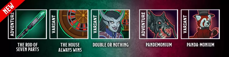 七神之杖 集齐完整的法杖,探索后续的未知。 完成区域1100 变体:庄家通吃 在巨型轮盘球的威胁下集齐完整的法杖。 阵型槽分为红色、黑色以及两个发光的绿色槽位。 一个巨型轮盘球将作为护卫加入阵型。 从进入区域101开始,此后每100个区域,巨型轮盘球会跳起并在阵型上方旋转一圈,然后随机落在一个阵型槽位上,移除该槽位的 champion 以及所有处于同色槽位的其他 champion。被移除的 champion 在本次冒险剩余时间内无法使用,轮盘球会停留在该槽位直至下次移动。一旦冠军被添加到编队中,便无法以其他方式从编队中移除。 完成区域1150 变体:双倍或一无所有 组装完整的法杖,获得有益的意外收获。 编队槽位颜色为红色、黑色以及两个发光的绿色槽位。 一个巨大的轮盘球作为护卫加入编队。 从进入区域76开始,之后每75个区域,巨大的轮盘球会跳起并在编队上方旋转一圈,然后随机落在一个编队槽位上,移除该槽位中的冠军以及所有其他处于相同颜色编队槽位的冠军。被移除的冠军在本次冒险剩余时间内无法使用,轮盘球会停留在该槽位直至再次移动。一旦冠军被添加到队伍中,便无法以其他方式移出队伍。 点击伤害仅在前25区域造成伤害(包括火焰呼吸效果)。 冒险期间无法使用火焰呼吸药水。 完成区域1200 解锁【意外收获】(常驻冠军) 万魔殿 穿越万魔殿,寻找 Vecna。 完成区域1150 变体:熊猫狂欢 穿越熊猫狂欢之地,寻找 Vecna。 每波会生成1-2只虚幻的华丽红熊猫。它们不会掉落金币,也不计入任务进度。 每当一只红熊猫被击败,敌人的伤害和移动速度就会提升50%,该效果会 multiplicative叠加,且在切换区域时重置。你只能使用邪恶阵营的冠军,因为只有他们才忍心攻击这些可爱的红熊猫。你应该为鼓励这种行为感到羞耻。 完成区域1200 全新常驻英雄:意外收获