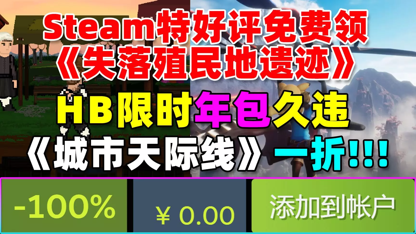 最后6小时!!!Steam免费领取《克劳沃特:失落殖民地遗迹》特好评指向点击解谜佳作!|年包久违回归!|多人生存冒险《精灵皮可》这对吗?!|《城市天际线》一折!