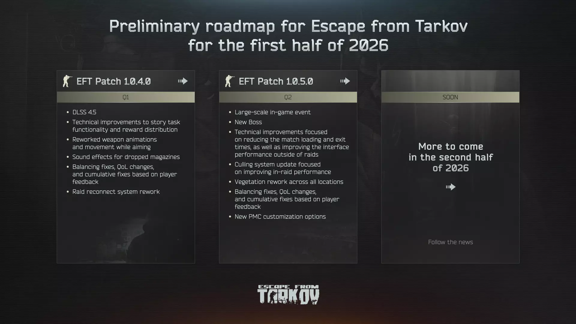 亲爱的玩家们!我们将继续致力于改进和扩展游戏基础架构,感谢大家在遇到技术问题的情况下,依然分享对《逃离塔科夫》发行的体验!《逃离塔科夫》更新内容: 我们计划在近期进行一系列技术更新,旨在解决以下问题: 1. 通过BSG启动器和Steam下载《逃离塔科夫》及《逃离塔科夫:竞技场》时出现的各种问题; 2. 与商人交互时出现错误228的多种原因,该错误会阻止玩家继续进行剧情任务; 3. 部分玩家在PvE区域游玩时, raid进度无法保存的问题; 4. raid过程中游戏声音消失的各种问题; 5. 快速切换角色界面时出现的界面重叠问题; 6. 纹理损坏导致部分子弹和 grenade fragments显示为紫色的各种问题。