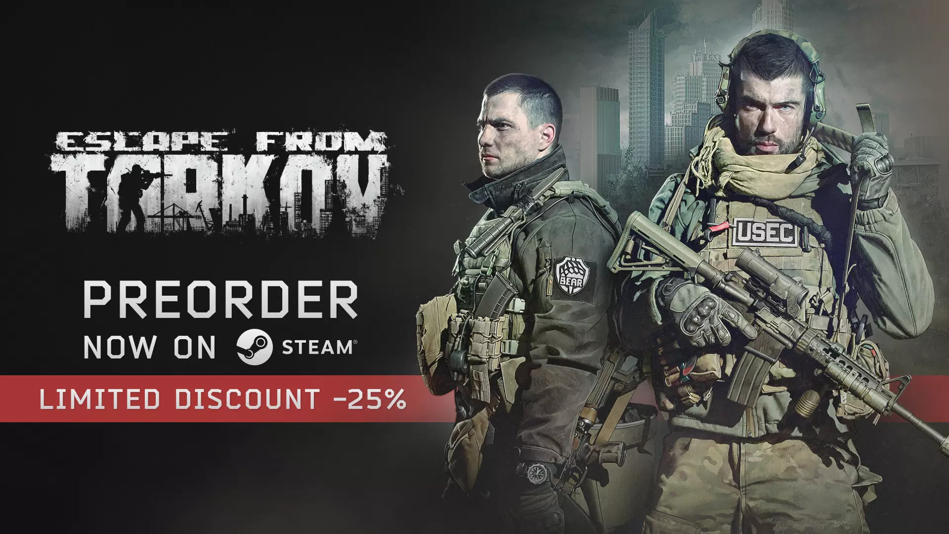 在《逃离塔科夫》正式发布前,我们很高兴地宣布其Steam预购现已开启。 我们欣喜地看到超过100万名玩家将该游戏加入愿望单,感谢大家的支持与信任!我们正在继续进行1.0版本的最终准备工作,并且已将Steam页面适配为20多种语言。 随着预购的开启,所有在Steam平台上的游戏版本均为Steam用户提供25%的专属折扣。该折扣将持续至《逃离塔科夫》正式发布。 请注意,若要在Steam上游玩《逃离塔科夫》,你必须拥有该游戏的Steam版本。更多信息