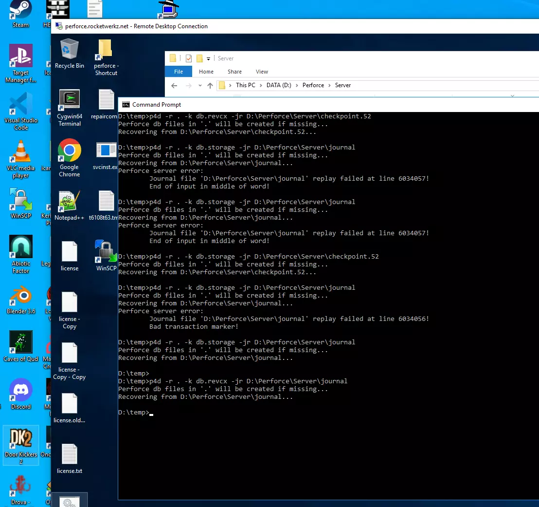 托管6TB关键数据远不止是一台配备几块固态硬盘的电脑那么简单。我们整个办公场所都配备了大容量的故障转移电池,用于RAID、备用和备份的多块高IO驱动器,并且需要NVMe驱动器来突破架构限制,以便通过局域网快速向多人提供这些数据。清晨的许多同步操作可能会使我们的10Gb上行链路饱和。 由于我们要覆盖实时数据占用,还需要提及为备份数据配置了20TB的硬盘存储,这样我们就能进行每日备份、按时间进行快照,并且留有空间以便按需进行全新的完整备份。但不能只有一个备份,实际上还需要备份的副本,因此还有另外20TB的存储。我们必须以另一种形式在异地云端再次备份所有数据,因此我们在新西兰以外的地理区域的数据中心额外配置了20TB的冷归档存储。由此可见,《翼星求生》仅6TB的关键数据,为确保其稳定存在,所需的已配置存储容量已迅速增加到100TB。 最近,系统突然停机和“蓝屏死机”问题导致我们的Perforce数据库出现数据损坏,以至于Perforce不得不关闭进行修复,开发人员也必须立即调整工作安排。修复Perforce需要做什么呢?Perforce在设计上通过数十个成对的数据库来运行和管理我们的文件、文件版本以及相关的元历史记录。当系统停止运行且数据库处于打开或写入状态时,数据库会损坏,并且这种损坏会严重影响工作效率。幸运的是,有特定的Perforce工具和命令可用于检查数据库文件对,我们已在内部维基中记录了相关流程。