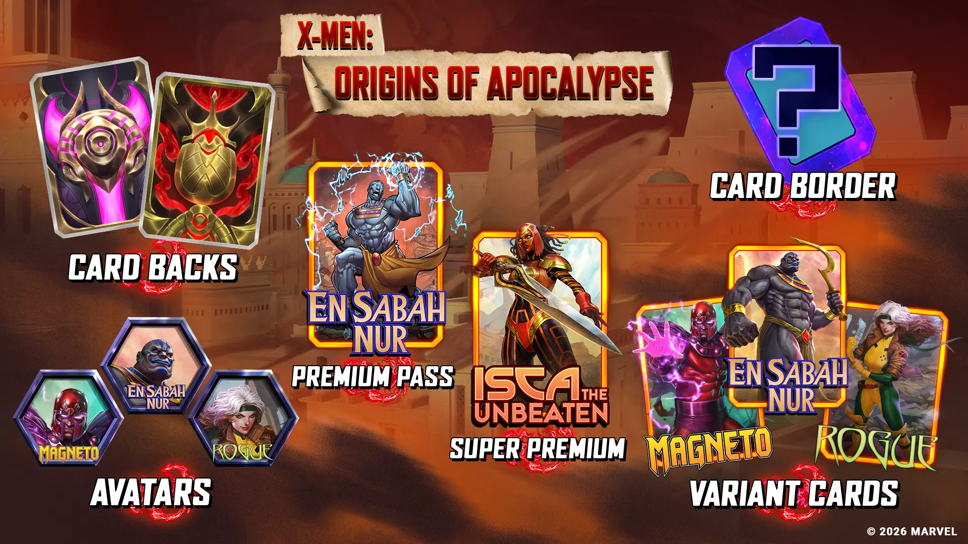 准备好,因为恩·沙巴·努尔已经降临,并且他刚刚给他的天启四骑士下达了新的任务目标。没错,还有一个新关键词!展望未来,我们将迎来团队冲突和高压:过载模式的回归,同时还有来自Dardo Studios和Junggeun Yoon的精彩新艺术画册!让我们先快速了解一下令人惊喜的网店奖励,然后深入探索我们的最新赛季!