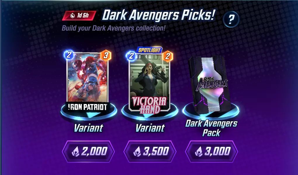 收集来自Dardo's Barcodes的这些超棒赛博朋克主题变体,即可获得更多奖励!收藏册将于3月3日推出。可用于完成收藏册的限定Dardo变体包括:钢铁侠、天启、暴风女、电索、惩罚者、X教授、13号特工、星爵、红骷髅、星云、卡魔拉以及魔多客!收集3个:拉玛-图特耸肩表情;收集6个:3个高级神秘边框;收集9个:红坦克-Dardo变体;收集12个:5000收藏家代币。