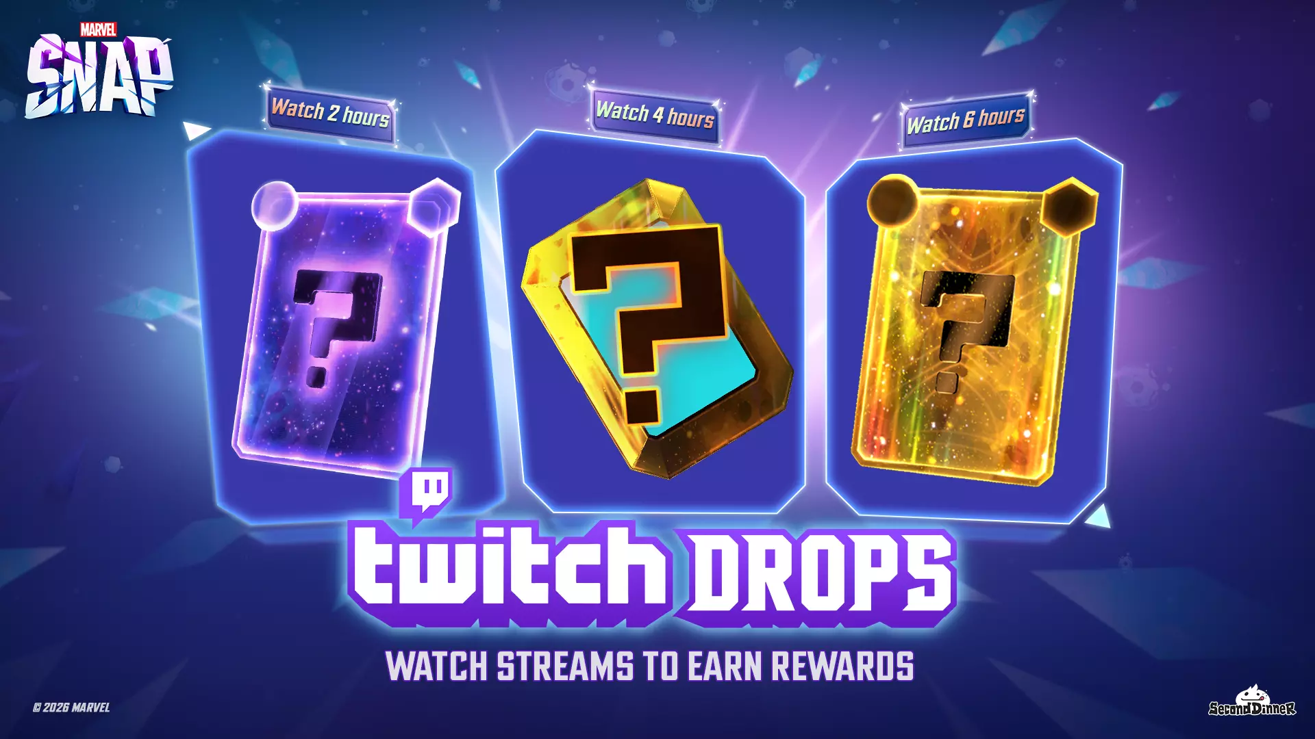 为庆祝2026年首届黄金护手资格赛,我们将于3月7日(周六)举办一场特别的Twitch掉落活动。该活动仅在官方《漫威 Snap》Twitch频道进行。掉落将于太平洋标准时间上午11点随着 tournament 开始而开启。tournament 结束后,直播将重播一次,以保持直播活跃,方便那些尚未完成掉落任务的玩家。我们不会在 tournament 结束后关闭直播,而是会循环播放比赛内容以保持直播活跃! 观看2小时可获得:155个电索强化剂 观看4小时可获得:电索 - 漫威传奇变体 对于有意参赛的玩家,参赛是免费的,报名将于2月27日开始,请关注相关社群和我们的社交媒体以获取更多信息!