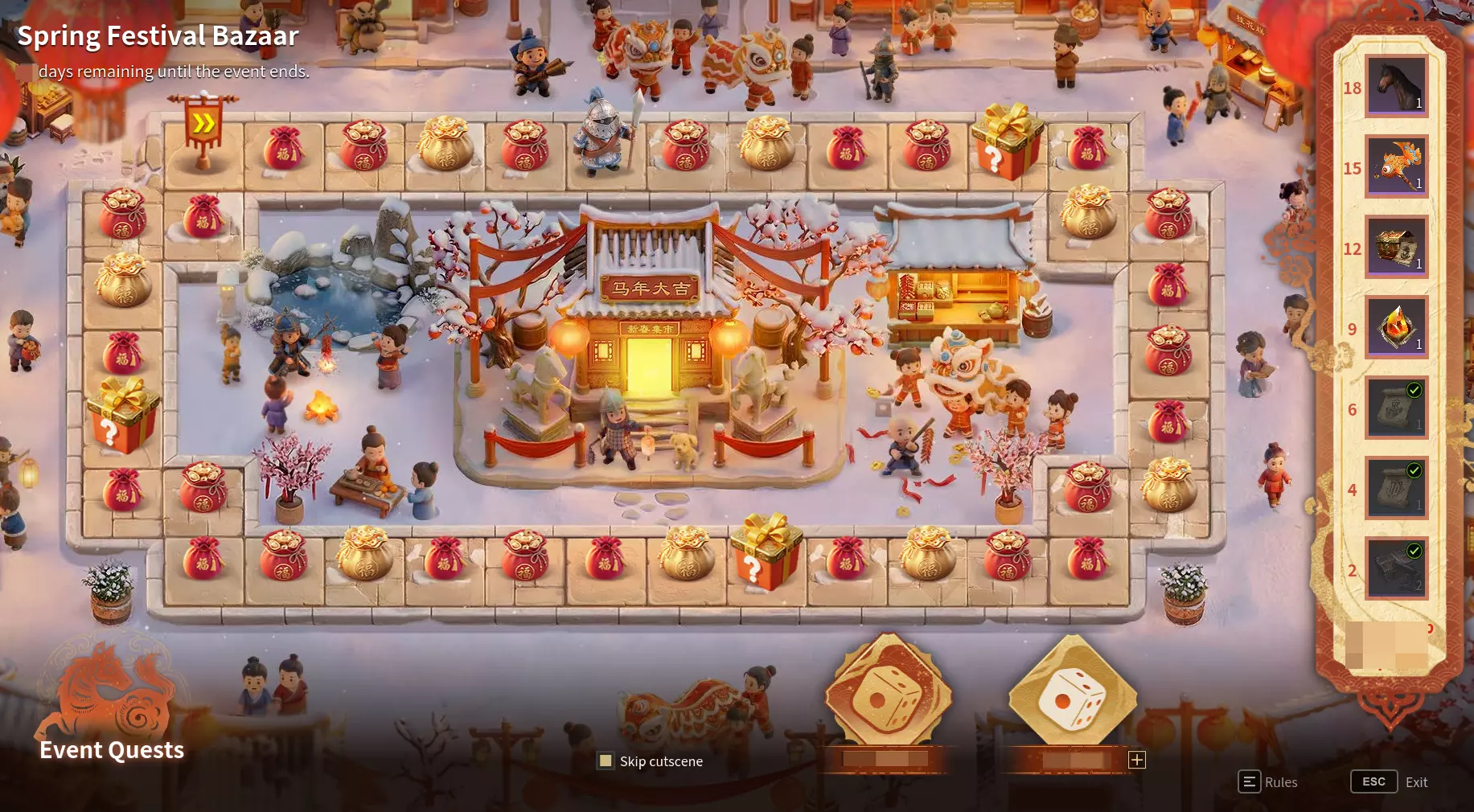 春节集市(3月5日结束,任务2月26日截止) 史诗坐骑!史诗坐骑!史诗坐骑!重要的事情必须说三遍! 大富翁式玩法。除史诗坐骑外,核心奖励为巨斧的锦鲤鱼服饰。任务将于26日0点截止——仅剩约十天时间。尚未获得该武器皮肤的军阀们要抓紧时间了!
