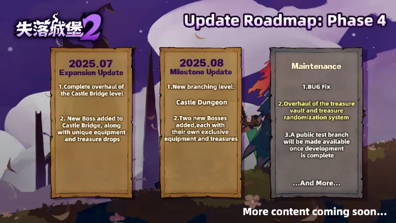 新分支关卡【城堡地牢】:通过桥梁下方的隐藏入口深入,探索黑城堡地牢被遗忘的深处。准备迎接危险——以及大量战利品。 两个全新 Boss:对抗两个强大的新敌人,每个敌人都守护着专属的宝藏和装备。 测试中的新机制:我们目前正在试验令人兴奋的新功能,如坐骑和变形,这些功能将附带独特武器和互动生物。敬请期待更多详情! 【宝库系统重做】 自抢先体验版推出以来,我们清晰地听到了您的反馈——部分系统过于复杂,学习曲线陡峭,选择过多,机制不明确。我们理解这一点——开发团队也有同感!《失落城堡2》宝藏系统优化更新内容 随着《失落城堡2》的不断发展,自3月更新以来,我们一直在对宝藏库及相关系统进行全面重做,旨在打造更流畅、更平衡的游戏体验。以下是更新亮点: 1. 简化宝藏效果:我们将精简部分复杂的宝藏效果,使其增益更加清晰易懂。 2. 改进掉落系统:将更容易集齐装备套装,打造你心仪的游玩风格。 3. 机制调整:我们正在调整某些机制和数值,以改善战斗节奏并增强策略深度。 这是一项仍在开发中的重大更新。准备就绪后,我们将以测试分支的形式发布,欢迎大家体验并分享反馈,帮助我们将其打磨至完美。我们致力于在未来的开发过程中更加透明,因此期待未来能带来更多此类更新。有任何反馈或想法吗?可以在评论区留言分享。感谢大家一直以来的支持,下次更新再见!