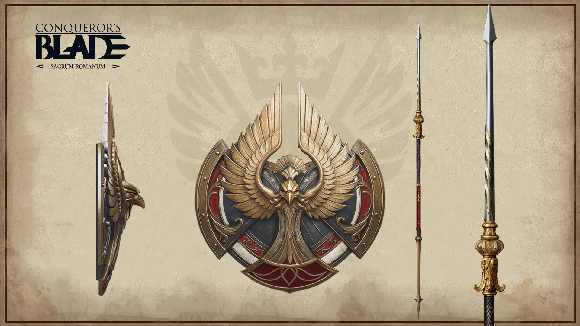 现在,让我们将注意力转向【神圣罗马:皇冠与十字架】赛季。赛季名称本身暗示了“皇冠”与“十字架”之间的核心冲突。这种权力斗争往往以最终的宗教惩罚——绝罚告终。“绝罚”(源自拉丁语excommunicatio,意为“脱离共融”)是一种宗教惩罚形式,会切断个人与信仰的联系,通常用于惩罚犯下禁忌行为的人。神圣罗马帝国的几位皇帝都曾面临绝罚,其中以亨利四世和腓特烈二世最为著名。“被绝罚的王国”指的是由这类人物统治的帝国,我们希望通过这一概念来展现神圣罗马帝国内教皇权威与帝国权威之间的分裂。在这样的历史背景下,我们开始思考哪些元素最能塑造神圣罗马赛季的武器外观。首先映入我们脑海的元素便是“鹰”。 鹰的图案及其意象起源于罗马。早在公元前107年,罗马政治家盖乌斯·马略当选执政官,并确立鹰旗(Aquila)为罗马军团的主要标志。它象征着罗马神话中的众神之王朱庇特。随着基督教的兴起和西罗马帝国的灭亡,北欧各族开始接纳基督教和罗马传统。而面临四面威胁的罗马教廷,也开始寻求强大的保护者。公元800年,法兰克国王查理曼由教皇加冕为罗马皇帝,其使用的雄鹰纹章后来被称为【帝国之鹰】,成为法兰克帝国的主要象征。 从那时起,由教皇加冕为罗马皇帝逐渐被视为欧洲君主合法性的终极来源。法兰克帝国分裂后,雄鹰的形象得到欧洲各国统治者的广泛认可。公元962年,东法兰克国王奥托大帝由教皇加冕为【罗马皇帝】。他的王朝奠定了神圣罗马帝国的基础,此后的历代国王开始将雄鹰形象饰于帝国权杖之上。当著名的腓特烈一世“红胡子”加冕为罗马皇帝时,鹰的图案开始扩展应用于旗帜和硬币之上。同样是在他统治期间,“神圣”一词首次出现在帝国的官方名称中。自此,鹰便成为帝国权威与帝国本身的直接象征,代表着帝国的尊严、合法性与权力。