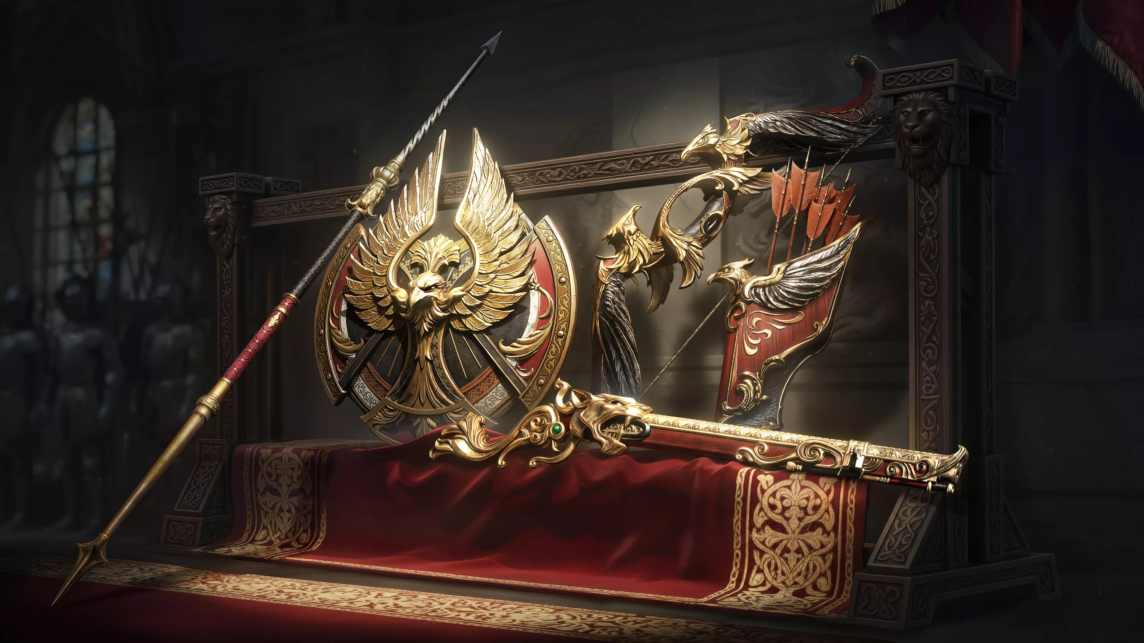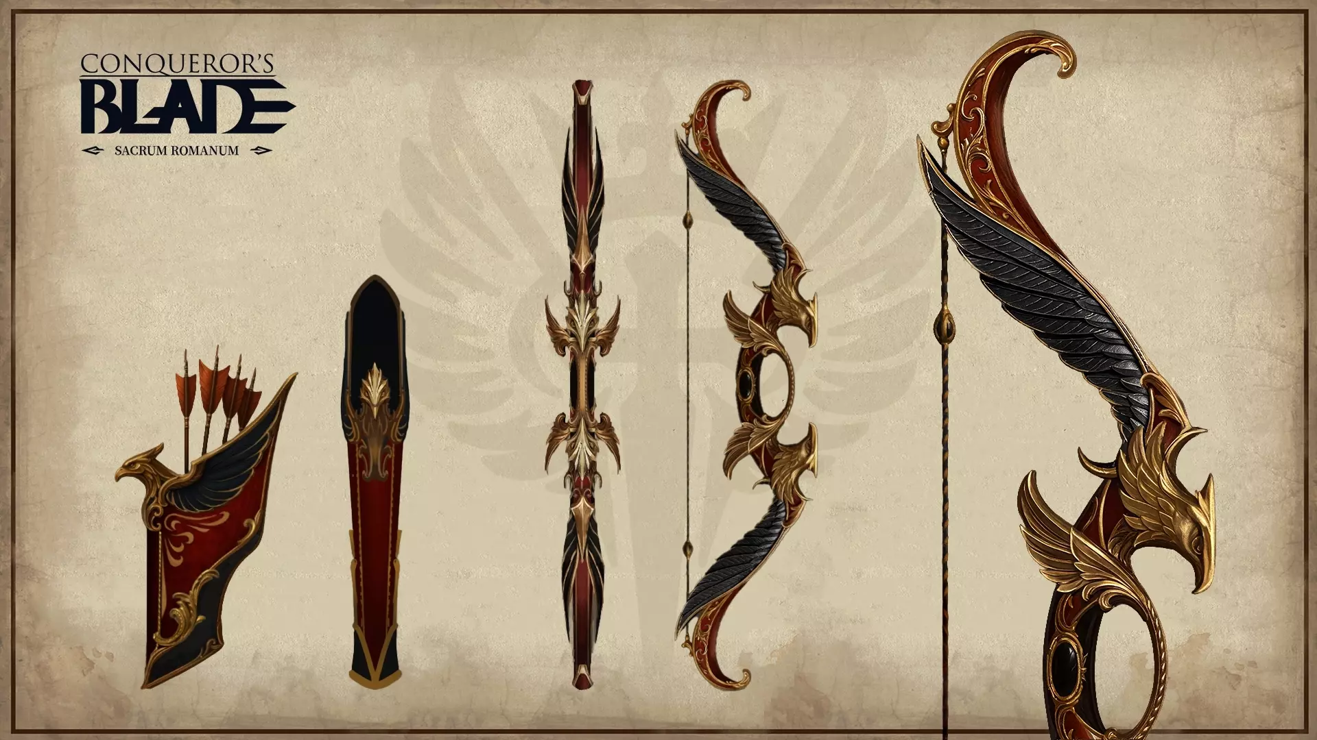 - 名称:雄鹰血契 - 描述:皇帝赐予的长矛,据说是仿照一件所有信徒都知晓的圣物打造而成。作为经皇帝与教会认可的加冕守护者,你肩负着帝国的誓言——立誓以鲜血捍卫其荣耀。 - 武器类型:盾与矛 围绕这一主题,我们将雄鹰元素融入弓身与箭袋的设计,打造出这款弓箭外观。