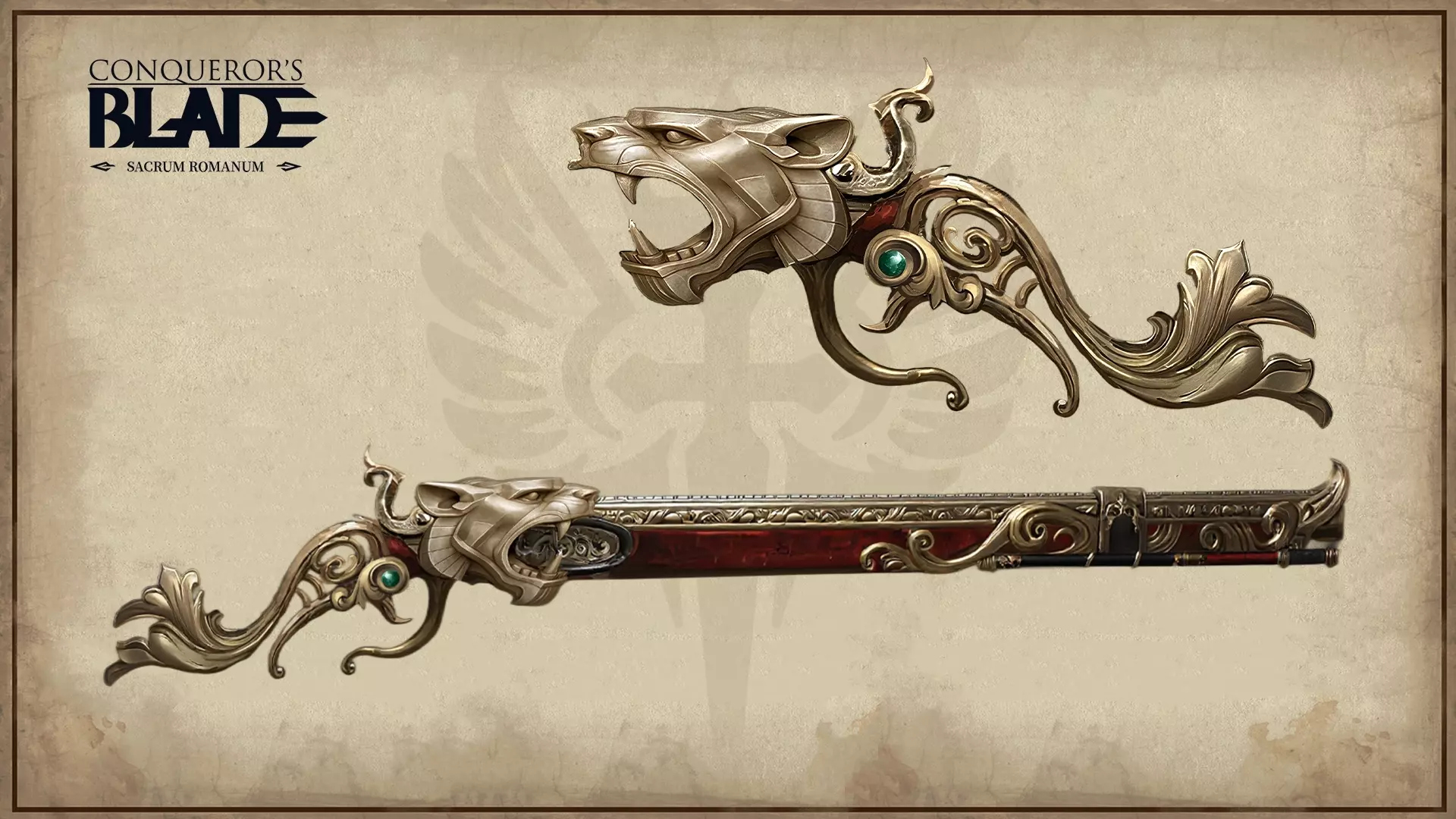 于是,我们迎来了第三件武器。在这款设计中,我们将狮子元素与滑膛枪的枪身相融合,营造出一种奢华高贵的氛围。