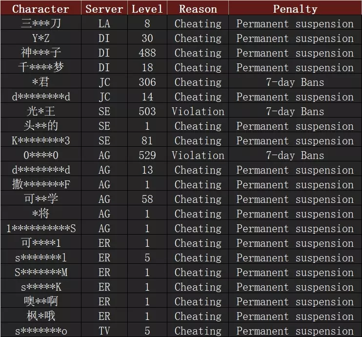 各位领主,大家好! 近期,我们注意到出现了一些违反游戏规则的行为。部分玩家在战场上使用外挂,还有玩家利用刷级脚本快速升级,以及在游戏内传播不当言论。所有这些行为都对《战意》整个社区的环境造成了影响。 我们希望所有领主都能享受纯粹的战斗乐趣,拥有最佳的游戏体验,不受任何违规行为的干扰。 因此,我们想借此机会提醒各位领主,近期我们发现使用外挂的账号被标记的数量显著增加,同时也存在售卖账号和钓鱼软件的网站。请勿出于好奇尝试使用任何此类工具,因为这可能会导致经济损失,并且极有可能危及您的账户安全。任何作弊软件的使用都将导致您的账户被封禁。 以下是最新的违规者名单及其处罚: