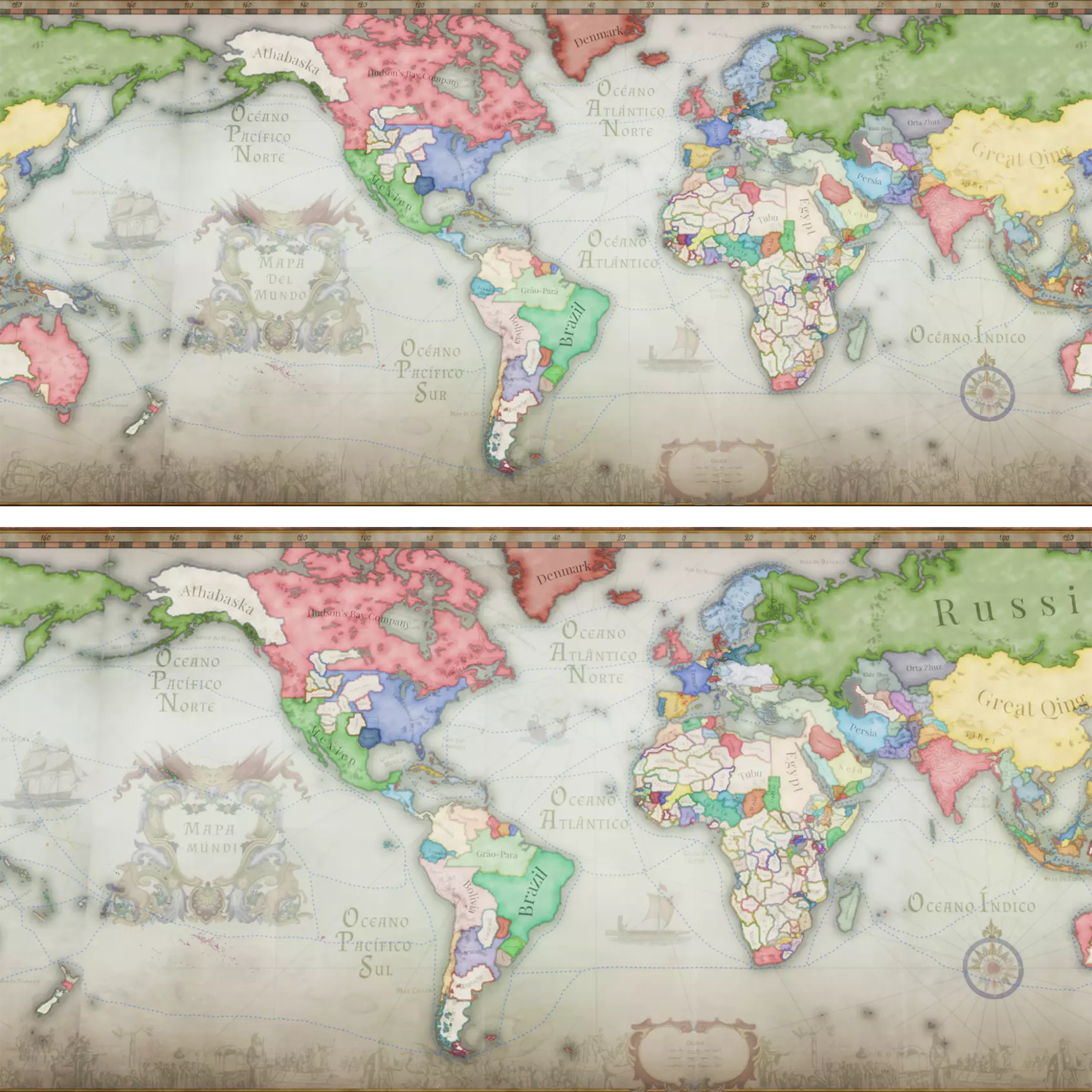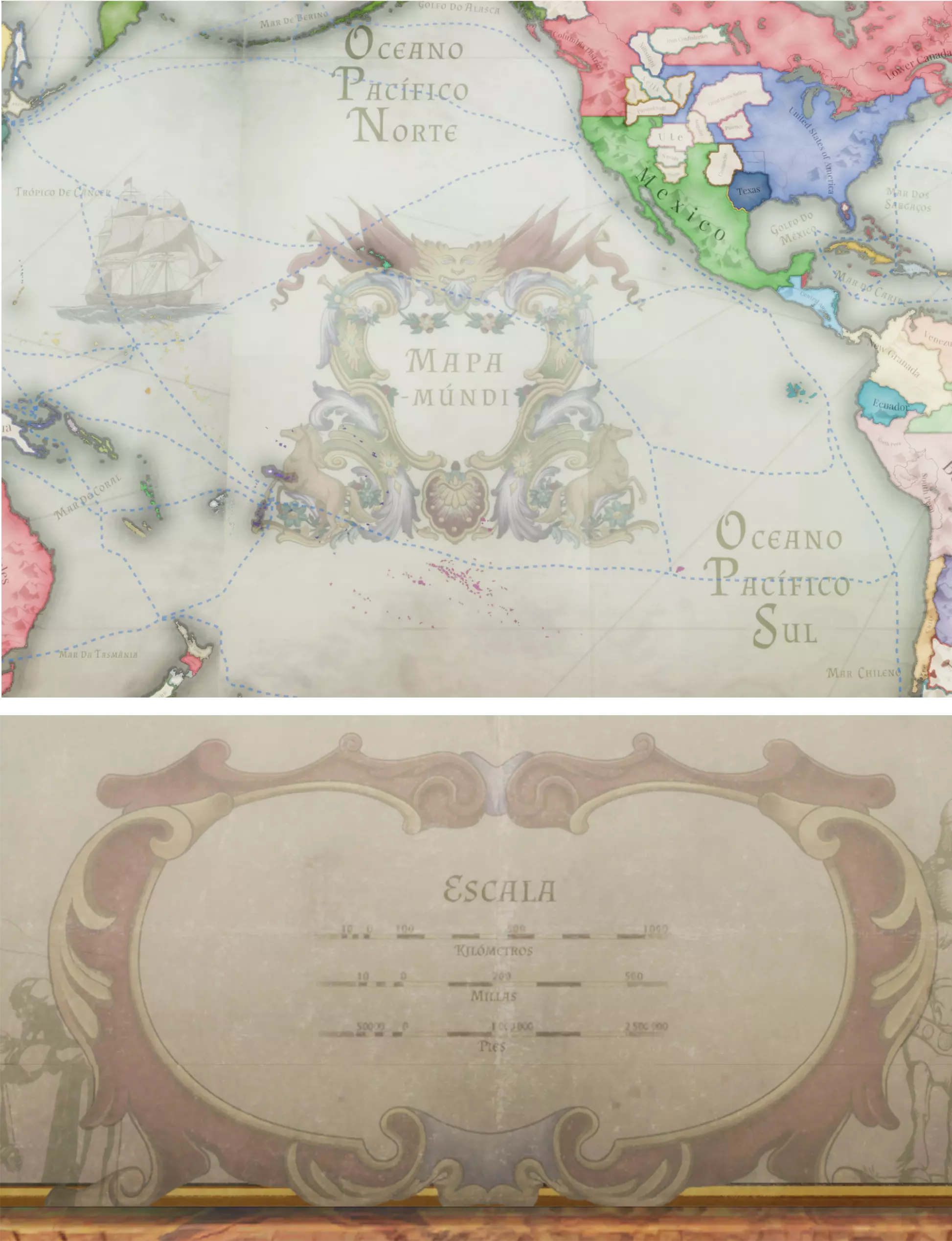 伊比利亚陶瓷风格主界面与暂停界面 纸质地图皮肤 如果你还记得,【民族觉醒】和【帝国枢纽】的纸质地图尝试了鲜艳的彩色插图。对于【伊比利亚黄昏】,我们决定减少海洋部分的色彩和插图。 葡萄牙和西班牙在1836年之前都是伟大的海军帝国,为了进一步强调这两个国家的航海历史,我们从17至19世纪的航海地图中汲取了灵感。
