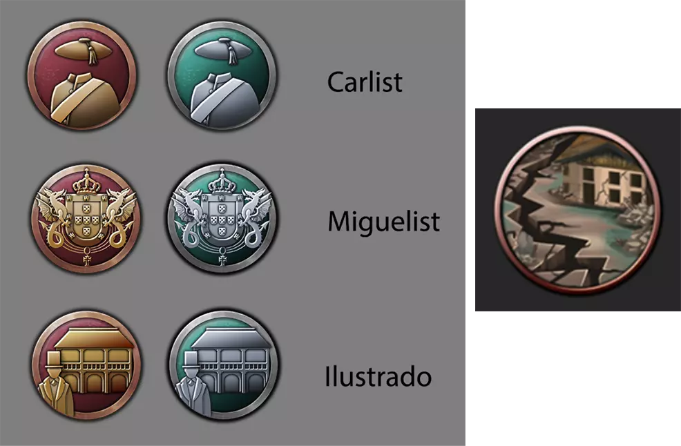 还有几个用于其他功能的新图标,例如【法律】、新的【权力集团核心】身份支柱以及新的【原则】,但这些在之前的开发日志中已经展示过,而且本开发日志的篇幅比预期要长。这真是个意外…… 成就将像往常一样在后续的开发日志中展示!以上就是伊比利亚黄昏的2D美术团队带来的全部内容。 在此,我们必须与大家道别。希望你们喜欢这次对伊比利亚黄昏美术设计的短暂了解,以及我们这些努力将维多利亚世界描绘得更好(?)或者至少是更复杂、更细致的关于苦难、挣扎、进步和利益的图景的创作者们的生活。一如既往,我们乐于听取你们的反馈,无论是好是坏。下周四我们将公布发布前的更新日志和成就,然后在11日发布时会像往常一样提供更新说明! 从本周五(28日)和下周五(5日)的欧洲中部时间14:00到16:00,Martin和Hansi将主持【伊比利亚黄昏】的发布前直播!发布当天,Martin和Lino将在欧洲中部时间15:30开始的发布直播中带您快速了解所有内容!